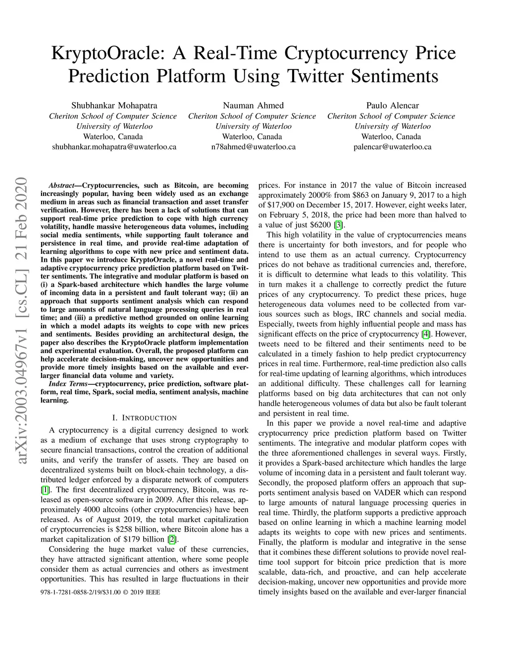 Cryptocurrencies, such as Bitcoin, are becoming increasingly popular, having been widely used as an exchange medium in areas such as financial transaction and asset transfer verification. However, there has been a lack of solutions that can support real-time price prediction to cope with high currency volatility, handle massive heterogeneous data volumes, including social media sentiments, while supporting fault tolerance and persistence in real time, and provide real-time adaptation of learning algorithms to cope with new price and sentiment data. In this paper we introduce KryptoOracle, a novel real-time and adaptive cryptocurrency price prediction platform based on Twitter sentiments. The integrative and modular platform is based on (i) a Spark-based architecture which handles the large volume of incoming data in a persistent and fault tolerant way; (ii) an approach that supports sentiment analysis which can respond to large amounts of natural language processing queries in real time; and (iii) a predictive method grounded on online learning in which a model adapts its weights to cope with new prices and sentiments. Besides providing an architectural design, the paper also describes the KryptoOracle platform implementation and experimental evaluation. Overall, the proposed platform can help accelerate decision-making, uncover new opportunities and provide more timely insights based on the available and ever-larger financial data volume and variety.