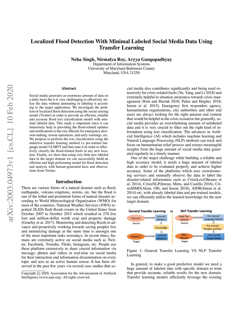 Social media generates an enormous amount of data on a daily basis but it is very challenging to effectively utilize the data without annotating or labeling it according to the target application. We investigate the problem of localized flood detection using the social sensing model (Twitter) in order to provide an efficient, reliable and accurate flood text classification model with minimal labeled data. This study is important since it can immensely help in providing the flood-related updates and notifications to the city officials for emergency decision making, rescue operations, and early warnings, etc. We propose to perform the text classification using the inductive transfer learning method i.e pre-trained language model ULMFiT and fine-tune it in order to effectively classify the flood-related feeds in any new location. Finally, we show that using very little new labeled data in the target domain we can successfully build an efficient and high performing model for flood detection and analysis with human-generated facts and observations from Twitter.