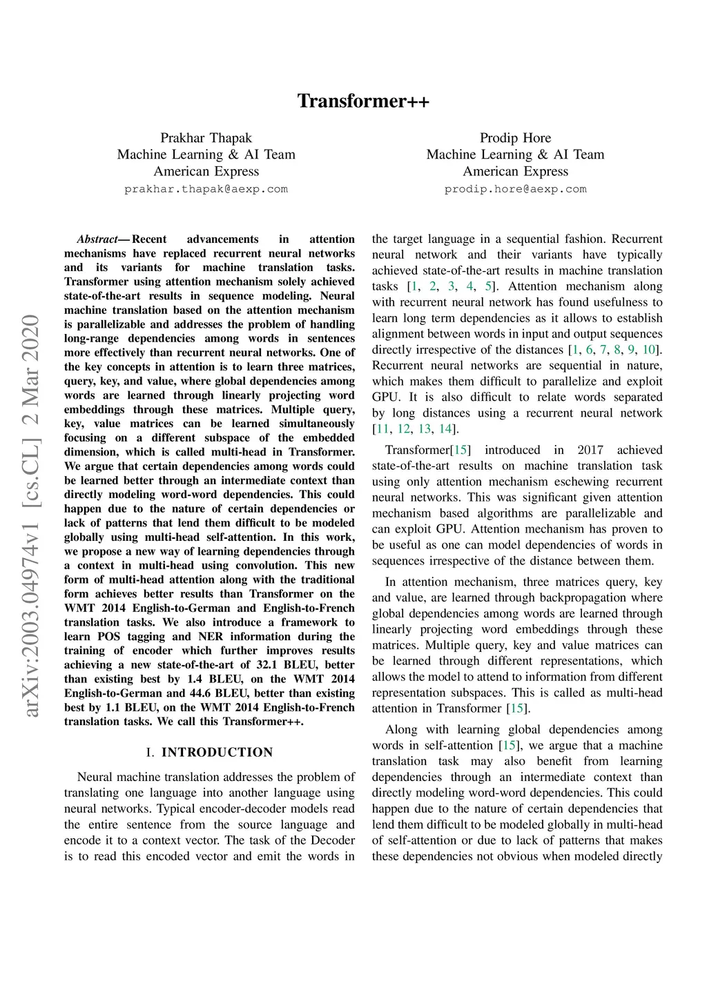 Recent advancements in attention mechanisms have replaced recurrent neural networks and its variants for machine translation tasks. Transformer using attention mechanism solely achieved state-of-the-art results in sequence modeling. Neural machine translation based on the attention mechanism is parallelizable and addresses the problem of handling long-range dependencies among words in sentences more effectively than recurrent neural networks. One of the key concepts in attention is to learn three matrices, query, key, and value, where global dependencies among words are learned through linearly projecting word embeddings through these matrices. Multiple query, key, value matrices can be learned simultaneously focusing on a different subspace of the embedded dimension, which is called multi-head in Transformer. We argue that certain dependencies among words could be learned better through an intermediate context than directly modeling word-word dependencies. This could happen due to the nature of certain dependencies or lack of patterns that lend them difficult to be modeled globally using multi-head self-attention. In this work, we propose a new way of learning dependencies through a context in multi-head using convolution. This new form of multi-head attention along with the traditional form achieves better results than Transformer on the WMT 2014 English-to-German and English-to-French translation tasks. We also introduce a framework to learn POS tagging and NER information during the training of encoder which further improves results achieving a new state-of-the-art of 32.1 BLEU, better than existing best by 1.4 BLEU, on the WMT 2014 English-to-German and 44.6 BLEU, better than existing best by 1.1 BLEU, on the WMT 2014 English-to-French translation tasks. We call this Transformer++.