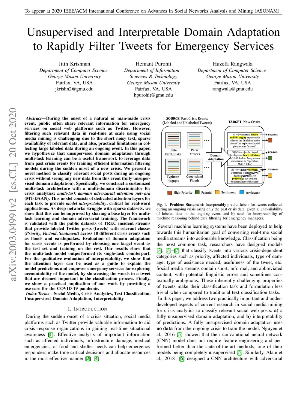 During the onset of a disaster event, filtering relevant information from the social web data is challenging due to its sparse availability and practical limitations in labeling datasets of an ongoing crisis. In this paper, we hypothesize that unsupervised domain adaptation through multi-task learning can be a useful framework to leverage data from past crisis events for training efficient information filtering models during the sudden onset of a new crisis. We present a novel method to classify relevant tweets during an ongoing crisis without seeing any new examples, using the publicly available dataset of TREC incident streams. Specifically, we construct a customized multi-task architecture with a multi-domain discriminator for crisis analytics: multi-task domain adversarial attention network. This model consists of dedicated attention layers for each task to provide model interpretability; critical for real-word applications. As deep networks struggle with sparse datasets, we show that this can be improved by sharing a base layer for multi-task learning and domain adversarial training. Evaluation of domain adaptation for crisis events is performed by choosing a target event as the test set and training on the rest. Our results show that the multi-task model outperformed its single task counterpart. For the qualitative evaluation of interpretability, we show that the attention layer can be used as a guide to explain the model predictions and empower emergency services for exploring accountability of the model, by showcasing the words in a tweet that are deemed important in the classification process. Finally, we show a practical implication of our work by providing a use-case for the COVID-19 pandemic.