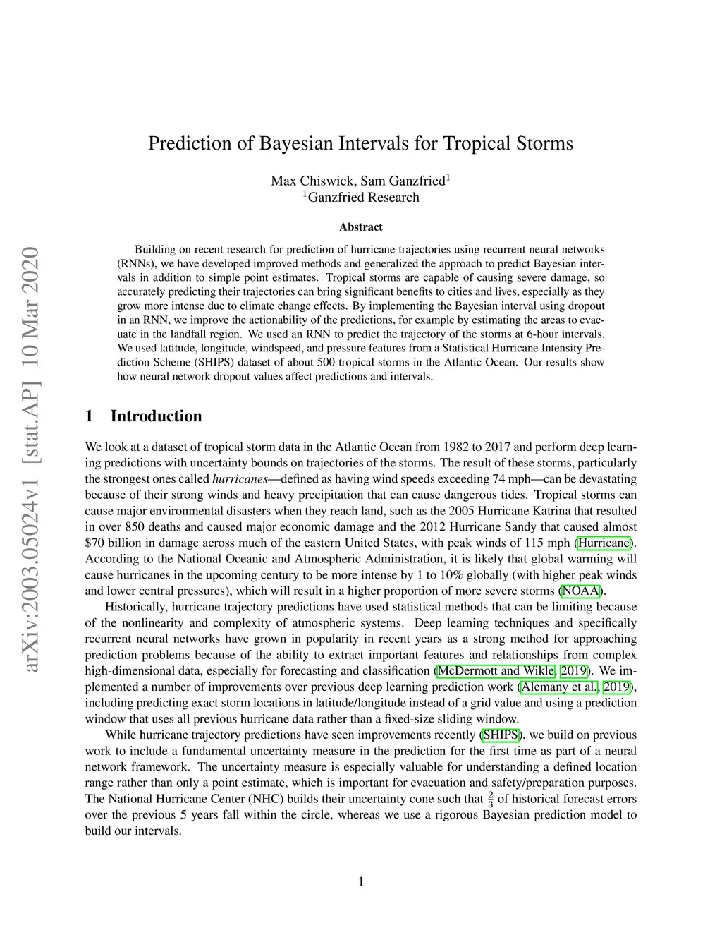 Building on recent research for prediction of hurricane trajectories using recurrent neural networks (RNNs), we have developed improved methods and generalized the approach to predict Bayesian intervals in addition to simple point estimates. Tropical storms are capable of causing severe damage, so accurately predicting their trajectories can bring significant benefits to cities and lives, especially as they grow more intense due to climate change effects. By implementing the Bayesian interval using dropout in an RNN, we improve the actionability of the predictions, for example by estimating the areas to evacuate in the landfall region. We used an RNN to predict the trajectory of the storms at 6-hour intervals. We used latitude, longitude, windspeed, and pressure features from a Statistical Hurricane Intensity Prediction Scheme (SHIPS) dataset of about 500 tropical storms in the Atlantic Ocean. Our results show how neural network dropout values affect predictions and intervals.