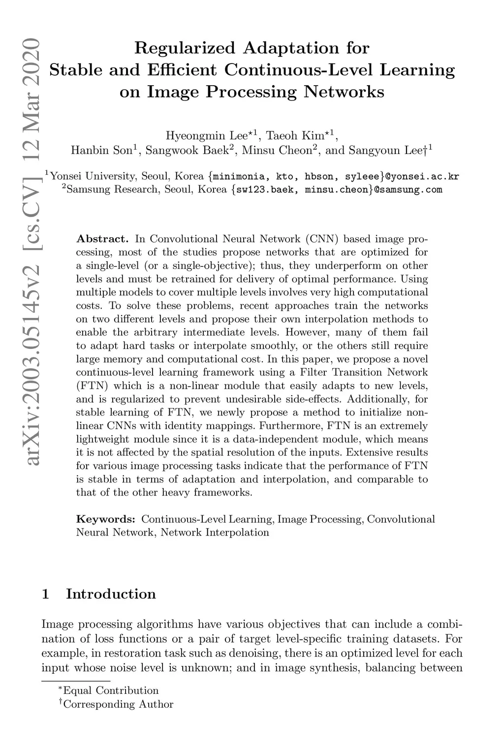 In Convolutional Neural Network (CNN) based image processing, most of the studies propose networks that are optimized for a single-level (or a single-objective); thus, they underperform on other levels and must be retrained for delivery of optimal performance. Using multiple models to cover multiple levels involves very high computational costs. To solve these problems, recent approaches train the networks on two different levels and propose their own interpolation methods to enable the arbitrary intermediate levels. However, many of them fail to adapt hard tasks or interpolate smoothly, or the others still require large memory and computational cost. In this paper, we propose a novel continuous-level learning framework using a Filter Transition Network (FTN) which is a non-linear module that easily adapt to new levels, and is regularized to prevent undesirable side-effects. Additionally, for stable learning of FTN, we newly propose a method to initialize non-linear CNNs with identity mappings. Furthermore, FTN is extremely lightweight module since it is a data-independent module, which means it is not affected by the spatial resolution of the inputs. Extensive results for various image processing tasks indicate that the performance of FTN is stable in terms of adaptation and interpolation, and comparable to that of the other heavy frameworks.