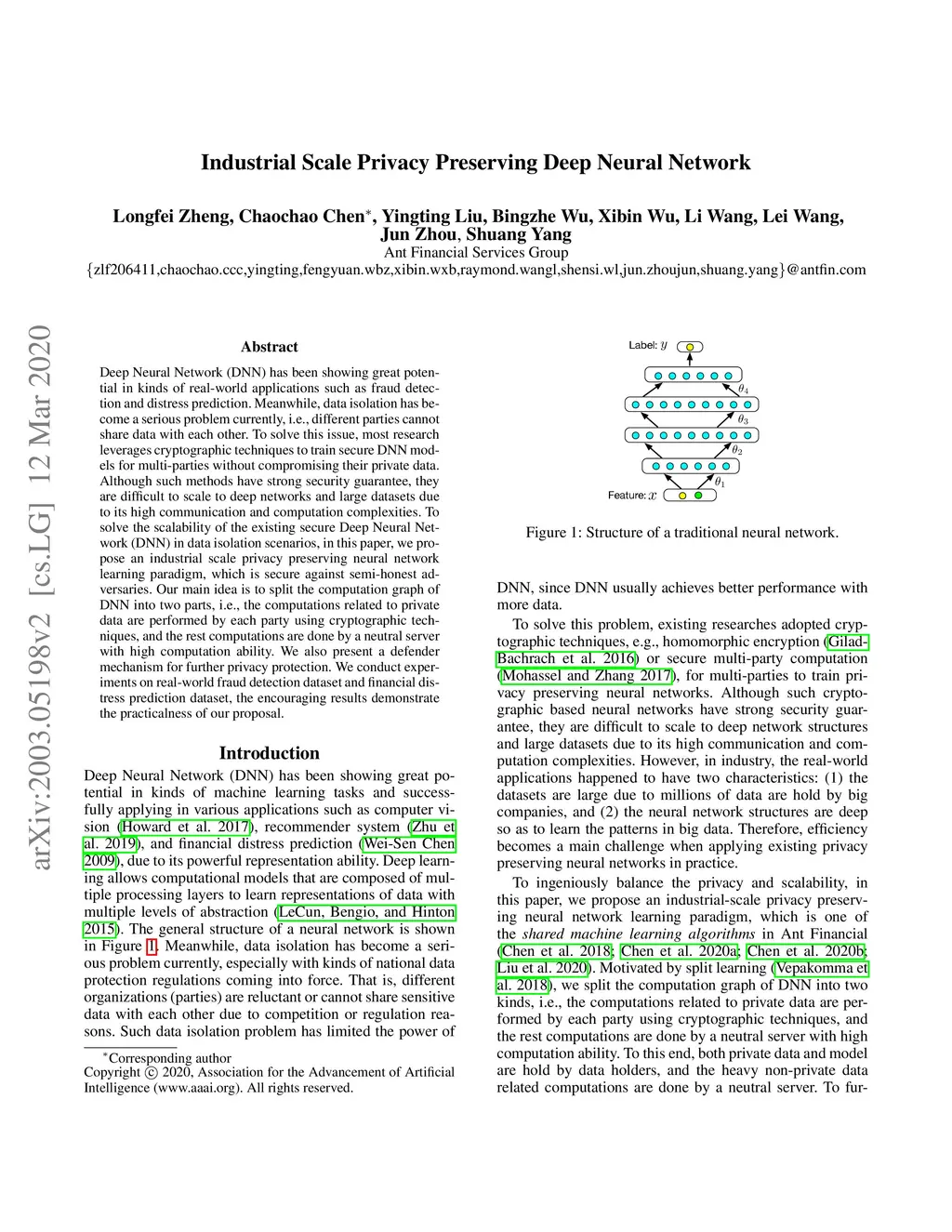Deep Neural Network (DNN) has been showing great potential in kinds of real-world applications such as fraud detection and distress prediction. Meanwhile, data isolation has become a serious problem currently, i.e., different parties cannot share data with each other. To solve this issue, most research leverages cryptographic techniques to train secure DNN models for multi-parties without compromising their private data. Although such methods have strong security guarantee, they are difficult to scale to deep networks and large datasets due to its high communication and computation complexities. To solve the scalability of the existing secure Deep Neural Network (DNN) in data isolation scenarios, in this paper, we propose an industrial scale privacy preserving neural network learning paradigm, which is secure against semi-honest adversaries. Our main idea is to split the computation graph of DNN into two parts, i.e., the computations related to private data are performed by each party using cryptographic techniques, and the rest computations are done by a neutral server with high computation ability. We also present a defender mechanism for further privacy protection. We conduct experiments on real-world fraud detection dataset and financial distress prediction dataset, the encouraging results demonstrate the practicalness of our proposal.