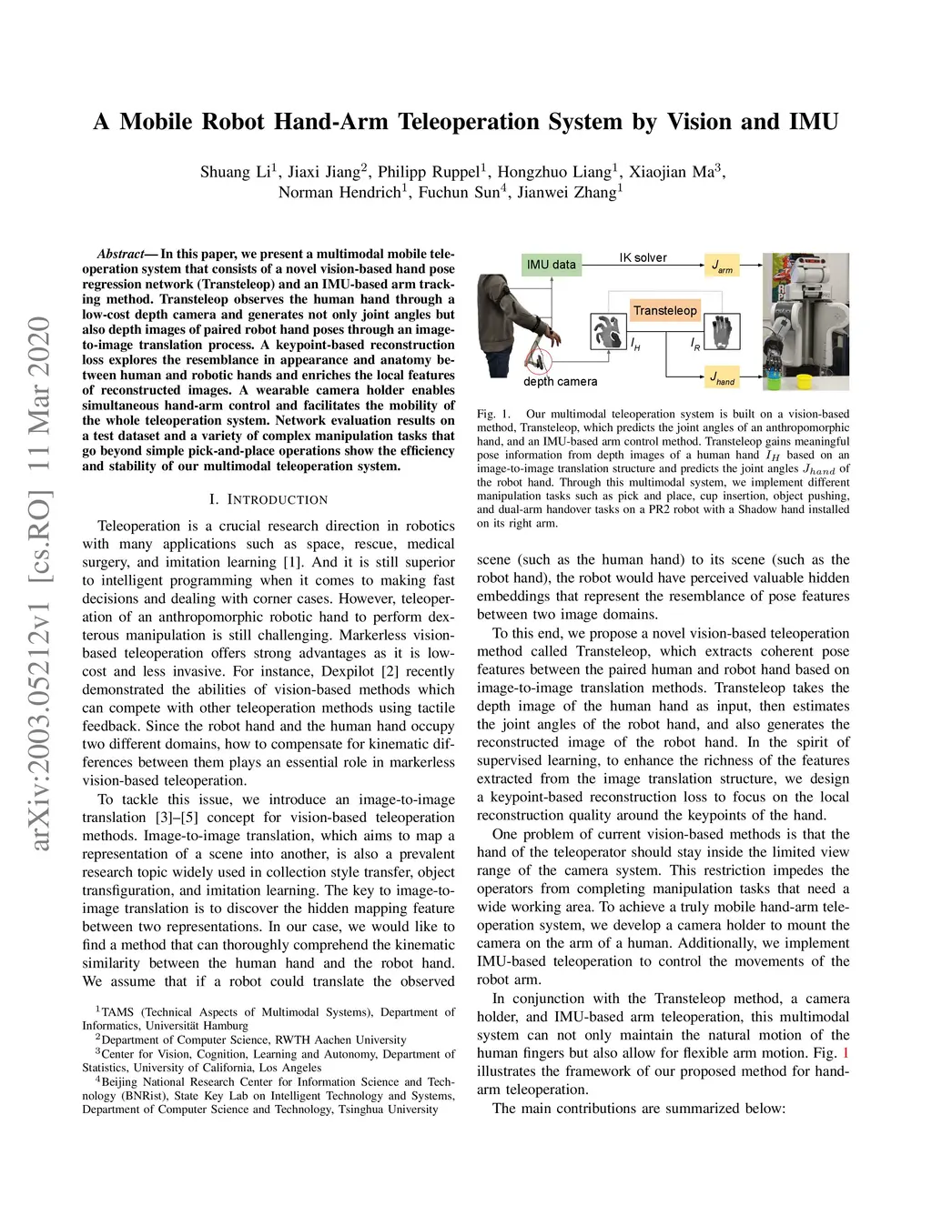 In this paper, we present a multimodal mobile teleoperation system that consists of a novel vision-based hand pose regression network (Transteleop) and an IMU-based arm tracking method. Transteleop observes the human hand through a low-cost depth camera and generates not only joint angles but also depth images of paired robot hand poses through an image-to-image translation process. A keypoint-based reconstruction loss explores the resemblance in appearance and anatomy between human and robotic hands and enriches the local features of reconstructed images. A wearable camera holder enables simultaneous hand-arm control and facilitates the mobility of the whole teleoperation system. Network evaluation results on a test dataset and a variety of complex manipulation tasks that go beyond simple pick-and-place operations show the efficiency and stability of our multimodal teleoperation system.