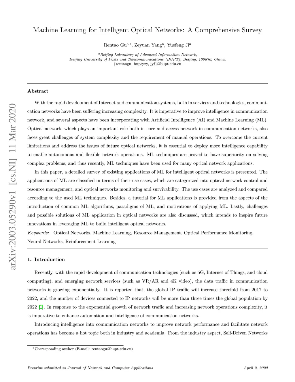 With the rapid development of Internet and communication systems, both in services and technologies, communication networks have been suffering increasing complexity. It is imperative to improve intelligence in communication network, and several aspects have been incorporating with Artificial Intelligence (AI) and Machine Learning (ML). Optical network, which plays an important role both in core and access network in communication networks, also faces great challenges of system complexity and the requirement of manual operations. To overcome the current limitations and address the issues of future optical networks, it is essential to deploy more intelligence capability to enable autonomous and exible network operations. ML techniques are proved to have superiority on solving complex problems; and thus recently, ML techniques have been used for many optical network applications. In this paper, a detailed survey of existing applications of ML for intelligent optical networks is presented. The applications of ML are classified in terms of their use cases, which are categorized into optical network control and resource management, and optical networks monitoring and survivability. The use cases are analyzed and compared according to the used ML techniques. Besides, a tutorial for ML applications is provided from the aspects of the introduction of common ML algorithms, paradigms of ML, and motivations of applying ML. Lastly, challenges and possible solutions of ML application in optical networks are also discussed, which intends to inspire future innovations in leveraging ML to build intelligent optical networks.