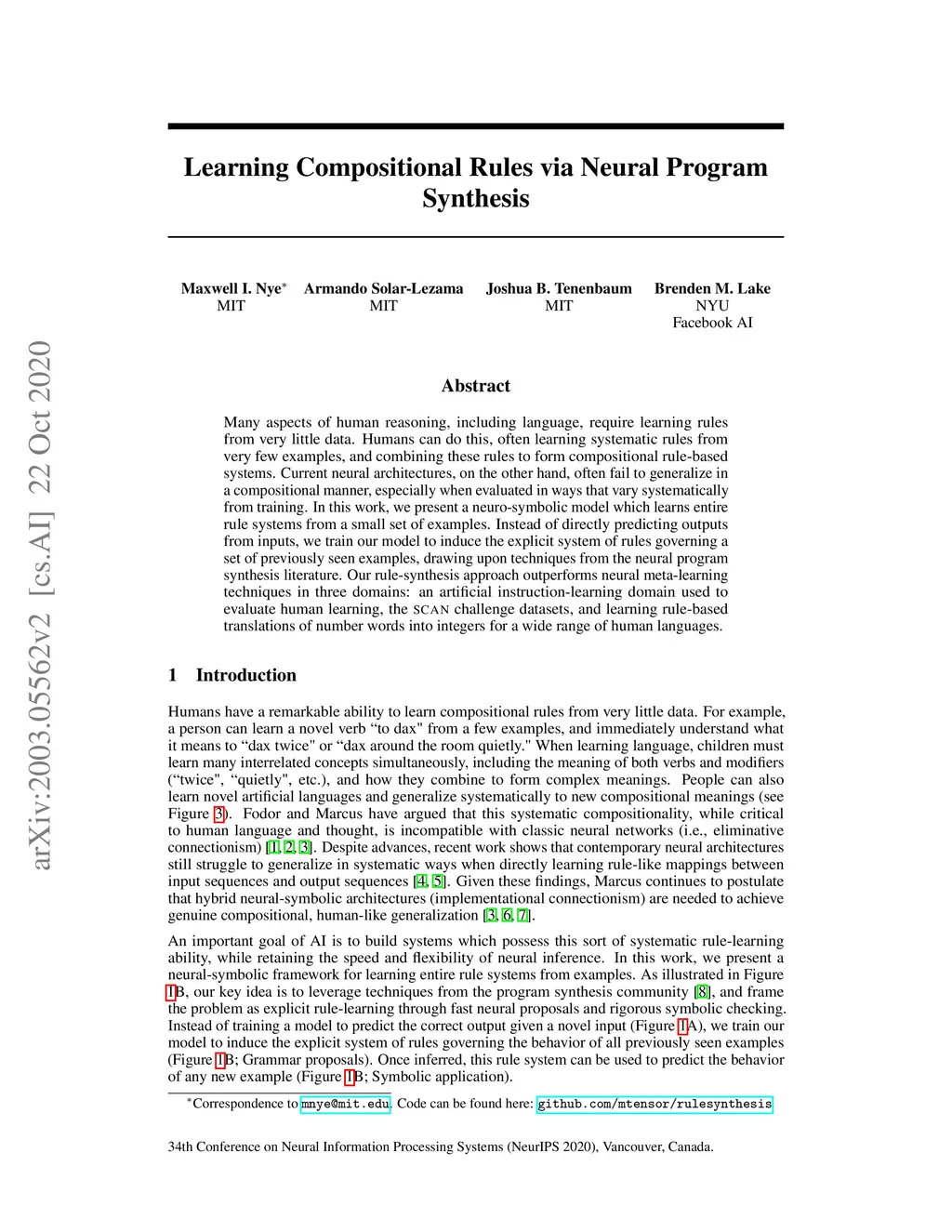 Many aspects of human reasoning, including language, require learning rules from very little data. Humans can do this, often learning systematic rules from very few examples, and combining these rules to form compositional rule-based systems. Current neural architectures, on the other hand, often fail to generalize in a compositional manner, especially when evaluated in ways that vary systematically from training. In this work, we present a neuro-symbolic model which learns entire rule systems from a small set of examples. Instead of directly predicting outputs from inputs, we train our model to induce the explicit system of rules governing a set of previously seen examples, drawing upon techniques from the neural program synthesis literature. Our rule-synthesis approach outperforms neural meta-learning techniques in three domains: an artificial instruction-learning domain used to evaluate human learning, the SCAN challenge datasets, and learning rule-based translations of number words into integers for a wide range of human languages.