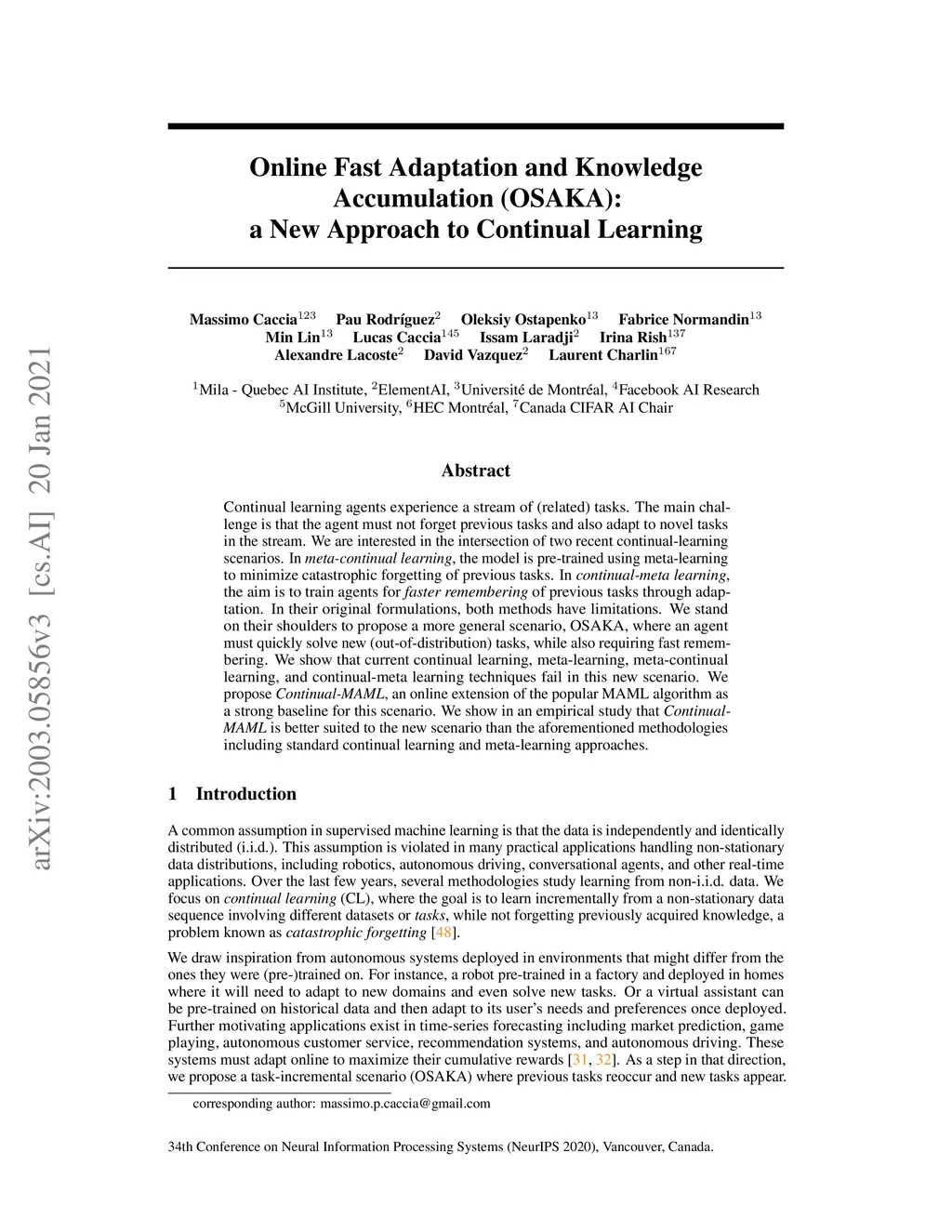 Continual learning studies agents that learn from streams of tasks without forgetting previous ones while adapting to new ones. Two recent continual-learning scenarios have opened new avenues of research. In meta-continual learning, the model is pre-trained to minimize catastrophic forgetting of previous tasks. In continual-meta learning, the aim is to train agents for faster remembering of previous tasks through adaptation. In their original formulations, both methods have limitations. We stand on their shoulders to propose a more general scenario, OSAKA, where an agent must quickly solve new (out-of-distribution) tasks, while also requiring fast remembering. We show that current continual learning, meta-learning, meta-continual learning, and continual-meta learning techniques fail in this new scenario. We propose Continual-MAML, an online extension of the popular MAML algorithm as a strong baseline for this scenario. We empirically show that Continual-MAML is better suited to the new scenario than the aforementioned methodologies, as well as standard continual learning and meta-learning approaches.