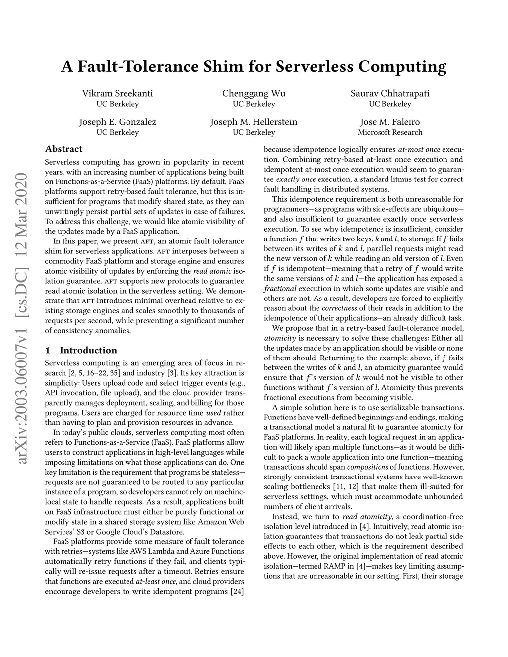 Serverless computing has grown in popularity in recent years, with an increasing number of applications being built on Functions-as-a-Service (FaaS) platforms. By default, FaaS platforms support retry-based fault tolerance, but this is insufficient for programs that modify shared state, as they can unwittingly persist partial sets of updates in case of failures. To address this challenge, we would like atomic visibility of the updates made by a FaaS application. In this paper, we present AFT, an atomic fault tolerance shim for serverless applications. AFT interposes between a commodity FaaS platform and storage engine and ensures atomic visibility of updates by enforcing the read atomic isolation guarantee. AFT supports new protocols to guarantee read atomic isolation in the serverless setting. We demonstrate that aft introduces minimal overhead relative to existing storage engines and scales smoothly to thousands of requests per second, while preventing a significant number of consistency anomalies.