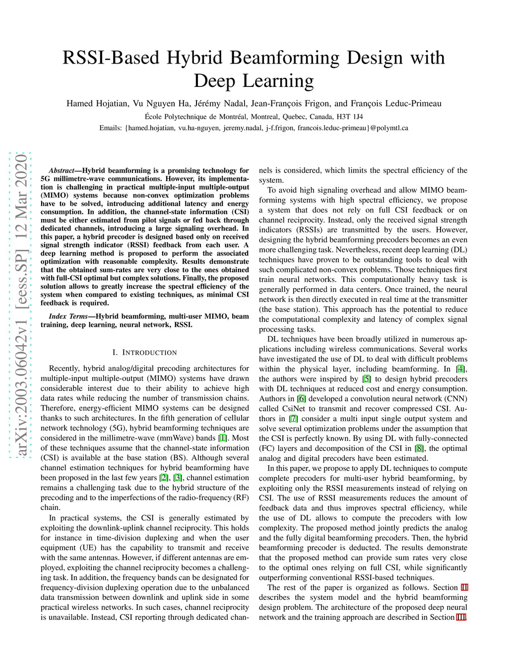 Hybrid beamforming is a promising technology for 5G millimetre-wave communications. However, its implementation is challenging in practical multiple-input multiple-output (MIMO) systems because non-convex optimization problems have to be solved, introducing additional latency and energy consumption. In addition, the channel-state information (CSI) must be either estimated from pilot signals or fed back through dedicated channels, introducing a large signaling overhead. In this paper, a hybrid precoder is designed based only on received signal strength indicator (RSSI) feedback from each user. A deep learning method is proposed to perform the associated optimization with reasonable complexity. Results demonstrate that the obtained sum-rates are very close to the ones obtained with full-CSI optimal but complex solutions. Finally, the proposed solution allows to greatly increase the spectral efficiency of the system when compared to existing techniques, as minimal CSI feedback is required.