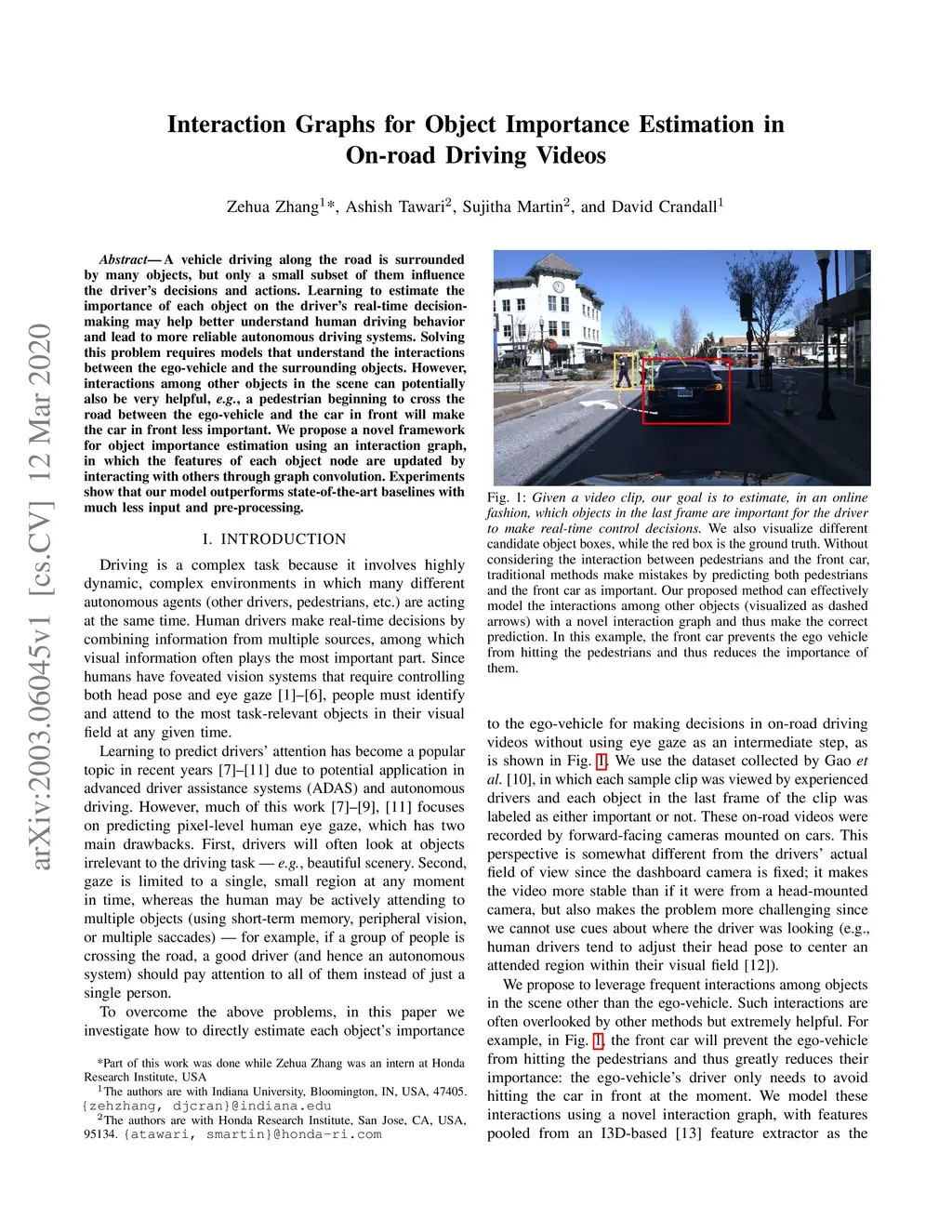 A vehicle driving along the road is surrounded by many objects, but only a small subset of them influence the driver's decisions and actions. Learning to estimate the importance of each object on the driver's real-time decision-making may help better understand human driving behavior and lead to more reliable autonomous driving systems. Solving this problem requires models that understand the interactions between the ego-vehicle and the surrounding objects. However, interactions among other objects in the scene can potentially also be very helpful, e.g., a pedestrian beginning to cross the road between the ego-vehicle and the car in front will make the car in front less important. We propose a novel framework for object importance estimation using an interaction graph, in which the features of each object node are updated by interacting with others through graph convolution. Experiments show that our model outperforms state-of-the-art baselines with much less input and pre-processing.