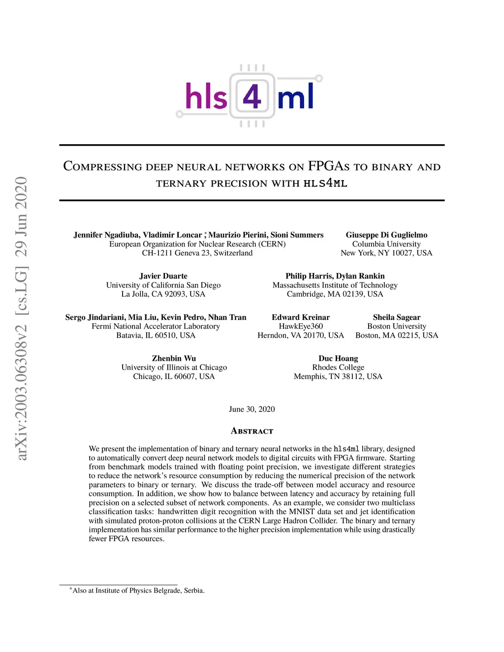 We present the implementation of binary and ternary neural networks in the hls4ml library, designed to automatically convert deep neural network models to digital circuits with FPGA firmware. Starting from benchmark models trained with floating point precision, we investigate different strategies to reduce the network's resource consumption by reducing the numerical precision of the network parameters to binary or ternary. We discuss the trade-off between model accuracy and resource consumption. In addition, we show how to balance between latency and accuracy by retaining full precision on a selected subset of network components. As an example, we consider two multiclass classification tasks: handwritten digit recognition with the MNIST data set and jet identification with simulated proton-proton collisions at the CERN Large Hadron Collider. The binary and ternary implementation has similar performance to the higher precision implementation while using drastically fewer FPGA resources.