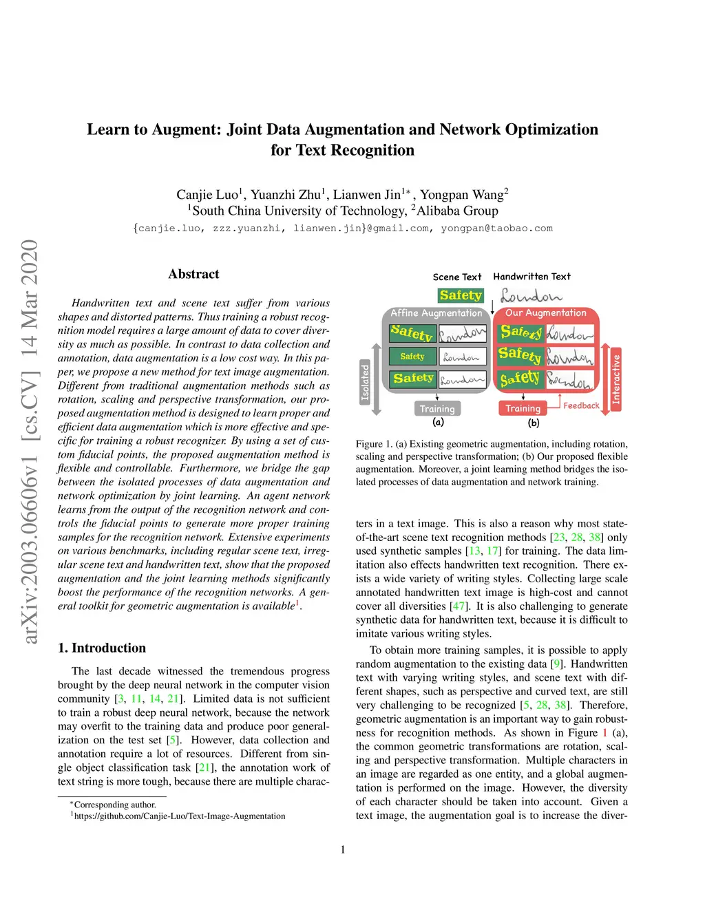 Handwritten text and scene text suffer from various shapes and distorted patterns. Thus training a robust recognition model requires a large amount of data to cover diversity as much as possible. In contrast to data collection and annotation, data augmentation is a low cost way. In this paper, we propose a new method for text image augmentation. Different from traditional augmentation methods such as rotation, scaling and perspective transformation, our proposed augmentation method is designed to learn proper and efficient data augmentation which is more effective and specific for training a robust recognizer. By using a set of custom fiducial points, the proposed augmentation method is flexible and controllable. Furthermore, we bridge the gap between the isolated processes of data augmentation and network optimization by joint learning. An agent network learns from the output of the recognition network and controls the fiducial points to generate more proper training samples for the recognition network. Extensive experiments on various benchmarks, including regular scene text, irregular scene text and handwritten text, show that the proposed augmentation and the joint learning methods significantly boost the performance of the recognition networks. A general toolkit for geometric augmentation is available.