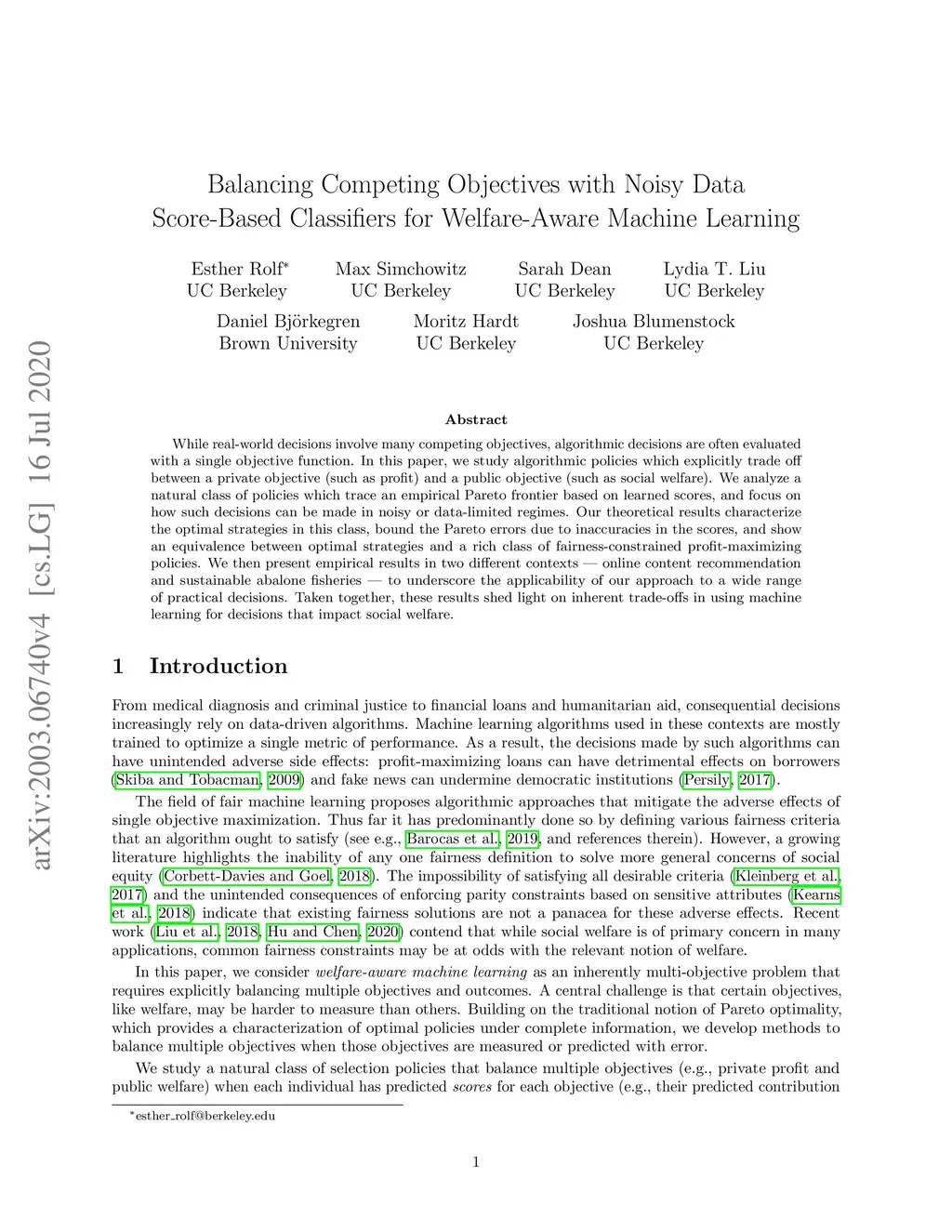 While real-world decisions involve many competing objectives, algorithmic decisions are often evaluated with a single objective function. In this paper, we study algorithmic policies which explicitly trade off between a private objective (such as profit) and a public objective (such as social welfare). We analyze a natural class of policies which trace an empirical Pareto frontier based on learned scores, and focus on how such decisions can be made in noisy or data-limited regimes. Our theoretical results characterize the optimal strategies in this class, bound the Pareto errors due to inaccuracies in the scores, and show an equivalence between optimal strategies and a rich class of fairness-constrained profit-maximizing policies. We then present empirical results in two different contexts -- online content recommendation and sustainable abalone fisheries -- to underscore the applicability of our approach to a wide range of practical decisions. Taken together, these results shed light on inherent trade-offs in using machine learning for decisions that impact social welfare.