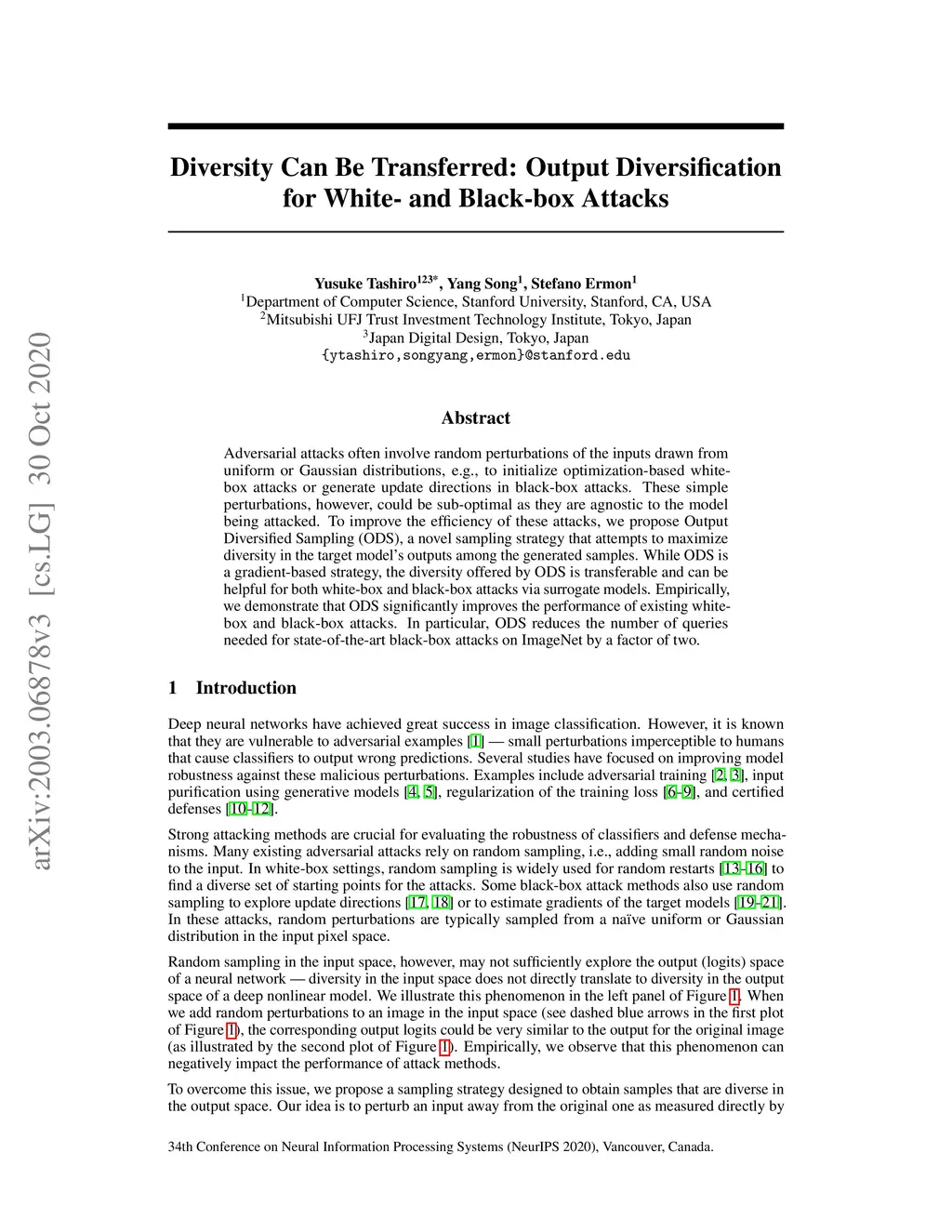 Adversarial attacks often involve random perturbations of the inputs drawn from uniform or Gaussian distributions, e.g., to initialize optimization-based white-box attacks or generate update directions in black-box attacks. These simple perturbations, however, could be sub-optimal as they are agnostic to the model being attacked. To improve the efficiency of these attacks, we propose Output Diversified Sampling (ODS), a novel sampling strategy that attempts to maximize diversity in the target model's outputs among the generated samples. While ODS is a gradient-based strategy, the diversity offered by ODS is transferable and can be helpful for both white-box and black-box attacks via surrogate models. Empirically, we demonstrate that ODS significantly improves the performance of existing white-box and black-box attacks. In particular, ODS reduces the number of queries needed for state-of-the-art black-box attacks on ImageNet by a factor of two.