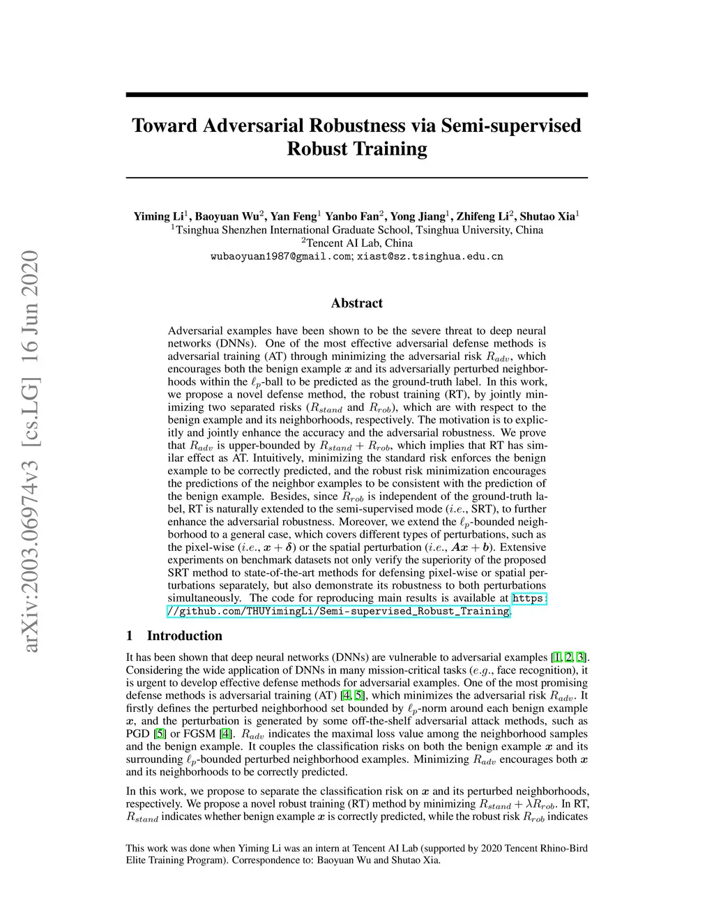 Adversarial examples have been shown to be the severe threat to deep neural networks (DNNs). One of the most effective adversarial defense methods is adversarial training (AT) through minimizing the adversarial risk RadvR_{adv}, which encourages both the benign example xx and its adversarially perturbed neighborhoods within the p\ell_{p}-ball to be predicted as the ground-truth label. In this work, we propose a novel defense method, the robust training (RT), by jointly minimizing two separated risks (RstandR_{stand} and RrobR_{rob}), which is with respect to the benign example and its neighborhoods respectively. The motivation is to explicitly and jointly enhance the accuracy and the adversarial robustness. We prove that RadvR_{adv} is upper-bounded by Rstand+RrobR_{stand} + R_{rob}, which implies that RT has similar effect as AT. Intuitively, minimizing the standard risk enforces the benign example to be correctly predicted, and the robust risk minimization encourages the predictions of the neighbor examples to be consistent with the prediction of the benign example. Besides, since RrobR_{rob} is independent of the ground-truth label, RT is naturally extended to the semi-supervised mode (i.e.i.e., SRT), to further enhance the adversarial robustness. Moreover, we extend the p\ell_{p}-bounded neighborhood to a general case, which covers different types of perturbations, such as the pixel-wise (i.e.i.e., x+δx + \delta) or the spatial perturbation (i.e.i.e., $ AX + b$). Extensive experiments on benchmark datasets not only verify the superiority of the proposed SRT method to state-of-the-art methods for defensing pixel-wise or spatial perturbations separately, but also demonstrate its robustness to both perturbations simultaneously. The code for reproducing main results is available at \url{https://github.com/THUYimingLi/Semi-supervised_Robust_Training}.