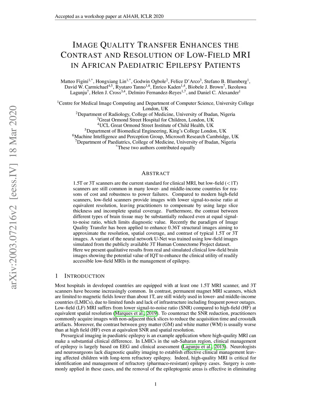 1.5T or 3T scanners are the current standard for clinical MRI, but low-field (<1T) scanners are still common in many lower- and middle-income countries for reasons of cost and robustness to power failures. Compared to modern high-field scanners, low-field scanners provide images with lower signal-to-noise ratio at equivalent resolution, leaving practitioners to compensate by using large slice thickness and incomplete spatial coverage. Furthermore, the contrast between different types of brain tissue may be substantially reduced even at equal signal-to-noise ratio, which limits diagnostic value. Recently the paradigm of Image Quality Transfer has been applied to enhance 0.36T structural images aiming to approximate the resolution, spatial coverage, and contrast of typical 1.5T or 3T images. A variant of the neural network U-Net was trained using low-field images simulated from the publicly available 3T Human Connectome Project dataset. Here we present qualitative results from real and simulated clinical low-field brain images showing the potential value of IQT to enhance the clinical utility of readily accessible low-field MRIs in the management of epilepsy.