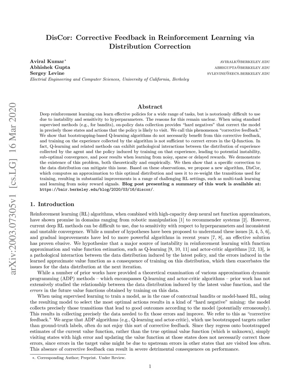 Deep reinforcement learning can learn effective policies for a wide range of tasks, but is notoriously difficult to use due to instability and sensitivity to hyperparameters. The reasons for this remain unclear. When using standard supervised methods (e.g., for bandits), on-policy data collection provides "hard negatives" that correct the model in precisely those states and actions that the policy is likely to visit. We call this phenomenon "corrective feedback." We show that bootstrapping-based Q-learning algorithms do not necessarily benefit from this corrective feedback, and training on the experience collected by the algorithm is not sufficient to correct errors in the Q-function. In fact, Q-learning and related methods can exhibit pathological interactions between the distribution of experience collected by the agent and the policy induced by training on that experience, leading to potential instability, sub-optimal convergence, and poor results when learning from noisy, sparse or delayed rewards. We demonstrate the existence of this problem, both theoretically and empirically. We then show that a specific correction to the data distribution can mitigate this issue. Based on these observations, we propose a new algorithm, DisCor, which computes an approximation to this optimal distribution and uses it to re-weight the transitions used for training, resulting in substantial improvements in a range of challenging RL settings, such as multi-task learning and learning from noisy reward signals. Blog post presenting a summary of this work is available at: https://bair.berkeley.edu/blog/2020/03/16/discor/.