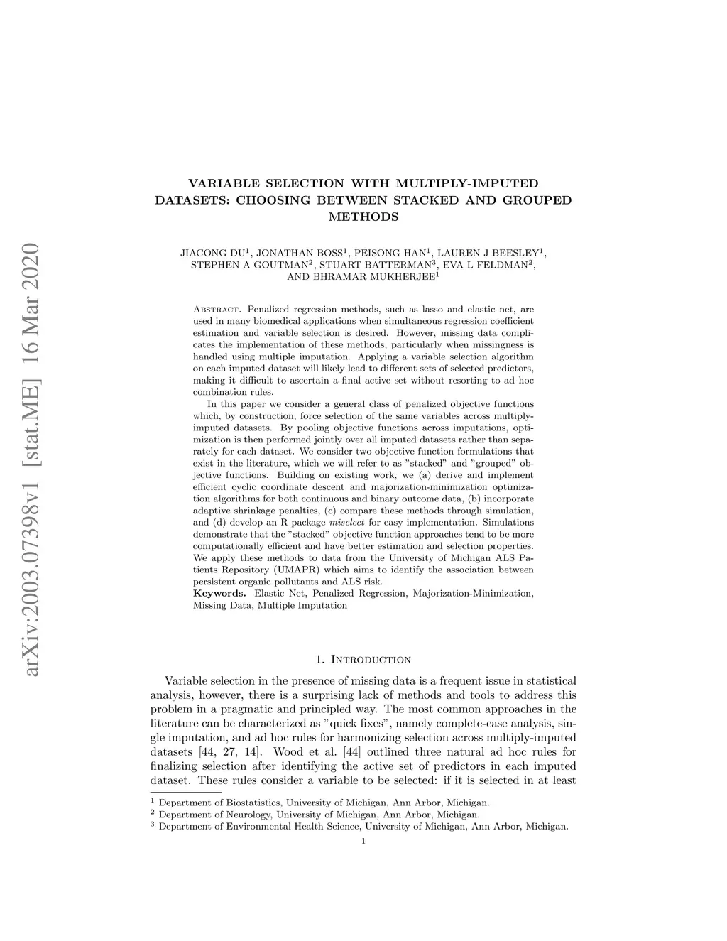 Penalized regression methods, such as lasso and elastic net, are used in many biomedical applications when simultaneous regression coefficient estimation and variable selection is desired. However, missing data complicates the implementation of these methods, particularly when missingness is handled using multiple imputation. Applying a variable selection algorithm on each imputed dataset will likely lead to different sets of selected predictors, making it difficult to ascertain a final active set without resorting to ad hoc combination rules. In this paper we consider a general class of penalized objective functions which, by construction, force selection of the same variables across multiply-imputed datasets. By pooling objective functions across imputations, optimization is then performed jointly over all imputed datasets rather than separately for each dataset. We consider two objective function formulations that exist in the literature, which we will refer to as "stacked" and "grouped" objective functions. Building on existing work, we (a) derive and implement efficient cyclic coordinate descent and majorization-minimization optimization algorithms for both continuous and binary outcome data, (b) incorporate adaptive shrinkage penalties, (c) compare these methods through simulation, and (d) develop an R package miselect for easy implementation. Simulations demonstrate that the "stacked" objective function approaches tend to be more computationally efficient and have better estimation and selection properties. We apply these methods to data from the University of Michigan ALS Patients Repository (UMAPR) which aims to identify the association between persistent organic pollutants and ALS risk.