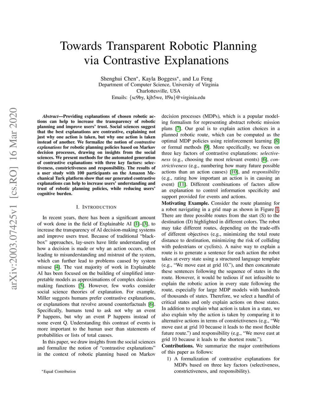 Providing explanations of chosen robotic actions can help to increase the transparency of robotic planning and improve users' trust. Social sciences suggest that the best explanations are contrastive, explaining not just why one action is taken, but why one action is taken instead of another. We formalize the notion of contrastive explanations for robotic planning policies based on Markov decision processes, drawing on insights from the social sciences. We present methods for the automated generation of contrastive explanations with three key factors: selectiveness, constrictiveness, and responsibility. The results of a user study with 100 participants on the Amazon Mechanical Turk platform show that our generated contrastive explanations can help to increase users' understanding and trust of robotic planning policies while reducing users' cognitive burden.