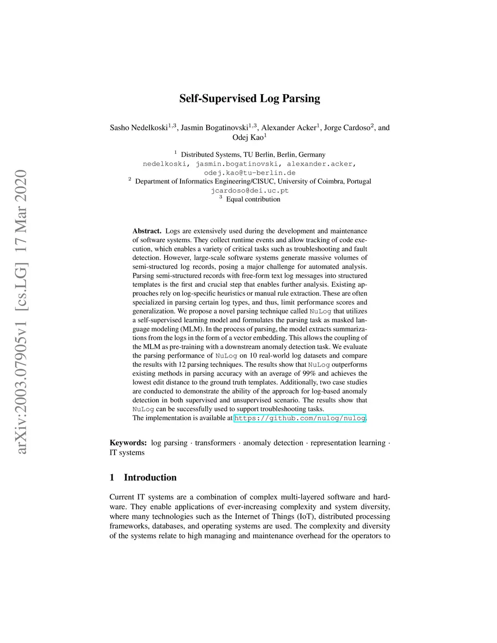 Logs are extensively used during the development and maintenance of software systems. They collect runtime events and allow tracking of code execution, which enables a variety of critical tasks such as troubleshooting and fault detection. However, large-scale software systems generate massive volumes of semi-structured log records, posing a major challenge for automated analysis. Parsing semi-structured records with free-form text log messages into structured templates is the first and crucial step that enables further analysis. Existing approaches rely on log-specific heuristics or manual rule extraction. These are often specialized in parsing certain log types, and thus, limit performance scores and generalization. We propose a novel parsing technique called NuLog that utilizes a self-supervised learning model and formulates the parsing task as masked language modeling (MLM). In the process of parsing, the model extracts summarizations from the logs in the form of a vector embedding. This allows the coupling of the MLM as pre-training with a downstream anomaly detection task. We evaluate the parsing performance of NuLog on 10 real-world log datasets and compare the results with 12 parsing techniques. The results show that NuLog outperforms existing methods in parsing accuracy with an average of 99% and achieves the lowest edit distance to the ground truth templates. Additionally, two case studies are conducted to demonstrate the ability of the approach for log-based anomaly detection in both supervised and unsupervised scenario. The results show that NuLog can be successfully used to support troubleshooting tasks. The implementation is available at https://github.com/nulog/nulog.