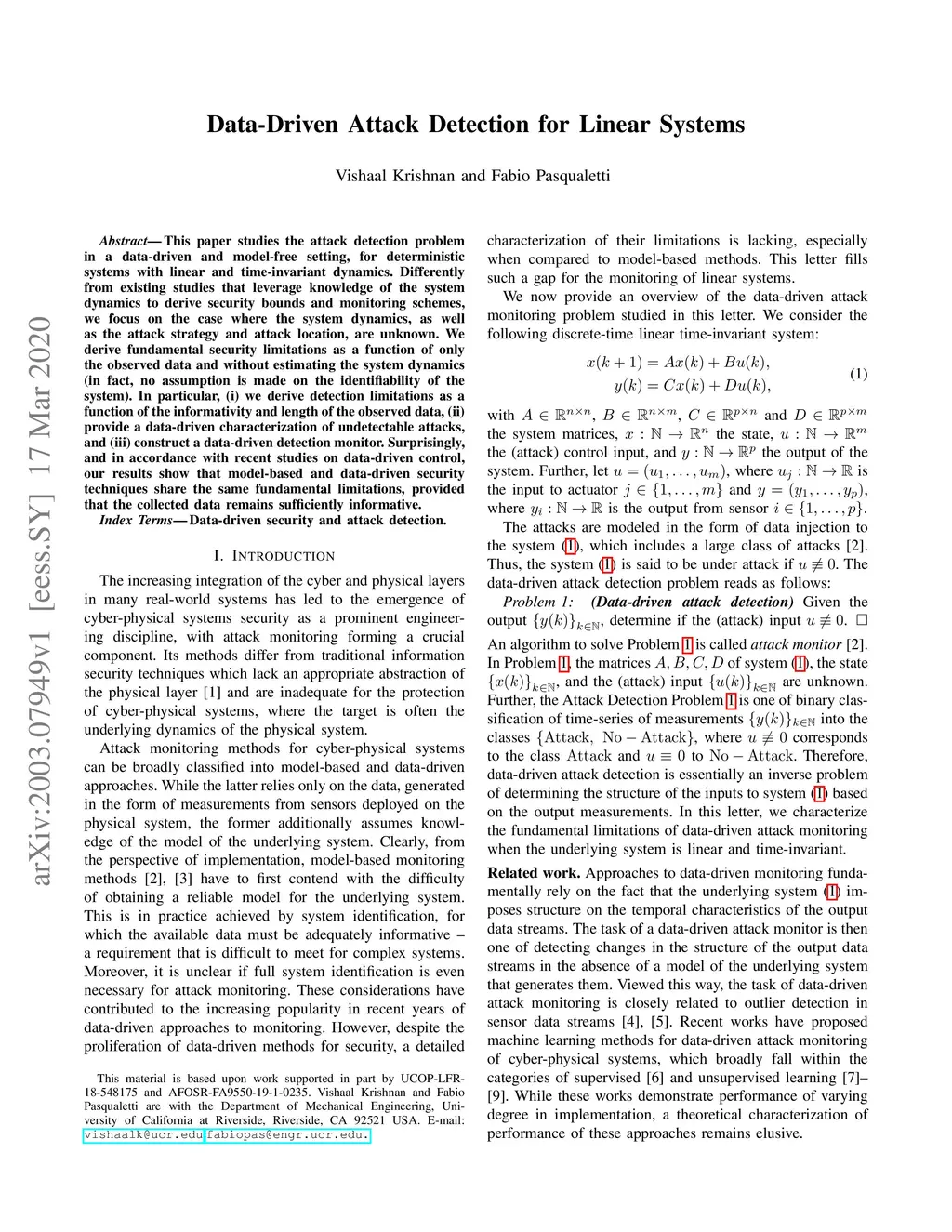 Data-Driven Attack Detection for Linear Systems