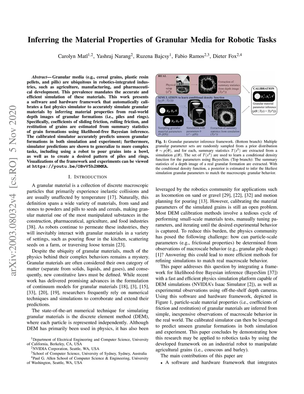 Granular media (e.g., cereal grains, plastic resin pellets, and pills) are ubiquitous in robotics-integrated industries, such as agriculture, manufacturing, and pharmaceutical development. This prevalence mandates the accurate and efficient simulation of these materials. This work presents a software and hardware framework that automatically calibrates a fast physics simulator to accurately simulate granular materials by inferring material properties from real-world depth images of granular formations (i.e., piles and rings). Specifically, coefficients of sliding friction, rolling friction, and restitution of grains are estimated from summary statistics of grain formations using likelihood-free Bayesian inference. The calibrated simulator accurately predicts unseen granular formations in both simulation and experiment; furthermore, simulator predictions are shown to generalize to more complex tasks, including using a robot to pour grains into a bowl, as well as to create a desired pattern of piles and rings. Visualizations of the framework and experiments can be viewed at https://youtu.be/OBvV5h2NMKA