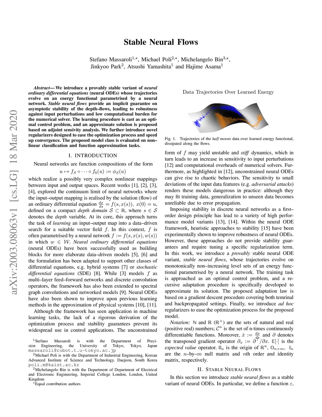 We introduce a provably stable variant of neural ordinary differential equations (neural ODEs) whose trajectories evolve on an energy functional parametrised by a neural network. Stable neural flows provide an implicit guarantee on asymptotic stability of the depth-flows, leading to robustness against input perturbations and low computational burden for the numerical solver. The learning procedure is cast as an optimal control problem, and an approximate solution is proposed based on adjoint sensivity analysis. We further introduce novel regularizers designed to ease the optimization process and speed up convergence. The proposed model class is evaluated on non-linear classification and function approximation tasks.