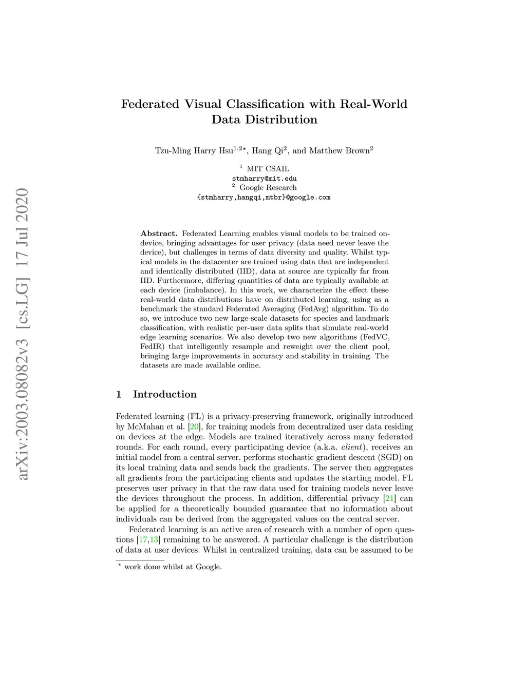 Federated Learning enables visual models to be trained on-device, bringing advantages for user privacy (data need never leave the device), but challenges in terms of data diversity and quality. Whilst typical models in the datacenter are trained using data that are independent and identically distributed (IID), data at source are typically far from IID. Furthermore, differing quantities of data are typically available at each device (imbalance). In this work, we characterize the effect these real-world data distributions have on distributed learning, using as a benchmark the standard Federated Averaging (FedAvg) algorithm. To do so, we introduce two new large-scale datasets for species and landmark classification, with realistic per-user data splits that simulate real-world edge learning scenarios. We also develop two new algorithms (FedVC, FedIR) that intelligently resample and reweight over the client pool, bringing large improvements in accuracy and stability in training. The datasets are made available online.