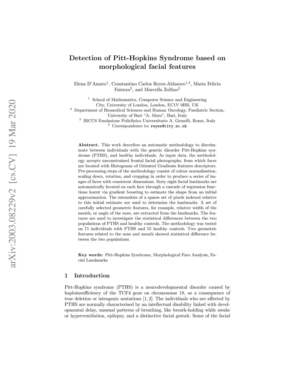 This work describes an automatic methodology to discriminate between individuals with the genetic disorder Pitt-Hopkins syndrome (PTHS), and healthy individuals. As input data, the methodology accepts unconstrained frontal facial photographs, from which faces are located with Histograms of Oriented Gradients features descriptors. Pre-processing steps of the methodology consist of colour normalisation, scaling down, rotation, and cropping in order to produce a series of images of faces with consistent dimensions. Sixty eight facial landmarks are automatically located on each face through a cascade of regression functions learnt via gradient boosting to estimate the shape from an initial approximation. The intensities of a sparse set of pixels indexed relative to this initial estimate are used to determine the landmarks. A set of carefully selected geometric features, for example, relative width of the mouth, or angle of the nose, are extracted from the landmarks. The features are used to investigate the statistical differences between the two populations of PTHS and healthy controls. The methodology was tested on 71 individuals with PTHS and 55 healthy controls. Two geometric features related to the nose and mouth showed statistical difference between the two populations.