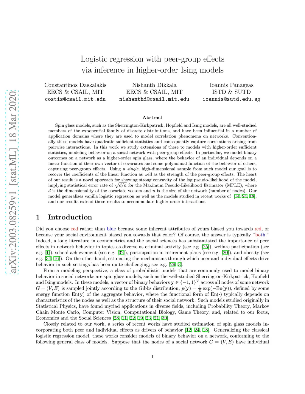 Spin glass models, such as the Sherrington-Kirkpatrick, Hopfield and Ising models, are all well-studied members of the exponential family of discrete distributions, and have been influential in a number of application domains where they are used to model correlation phenomena on networks. Conventionally these models have quadratic sufficient statistics and consequently capture correlations arising from pairwise interactions. In this work we study extensions of these to models with higher-order sufficient statistics, modeling behavior on a social network with peer-group effects. In particular, we model binary outcomes on a network as a higher-order spin glass, where the behavior of an individual depends on a linear function of their own vector of covariates and some polynomial function of the behavior of others, capturing peer-group effects. Using a {\em single}, high-dimensional sample from such model our goal is to recover the coefficients of the linear function as well as the strength of the peer-group effects. The heart of our result is a novel approach for showing strong concavity of the log pseudo-likelihood of the model, implying statistical error rate of for the Maximum Pseudo-Likelihood Estimator (MPLE), where is the dimensionality of the covariate vectors and is the size of the network (number of nodes). Our model generalizes vanilla logistic regression as well as the peer-effect models studied in recent works, and our results extend these results to accommodate higher-order interactions.