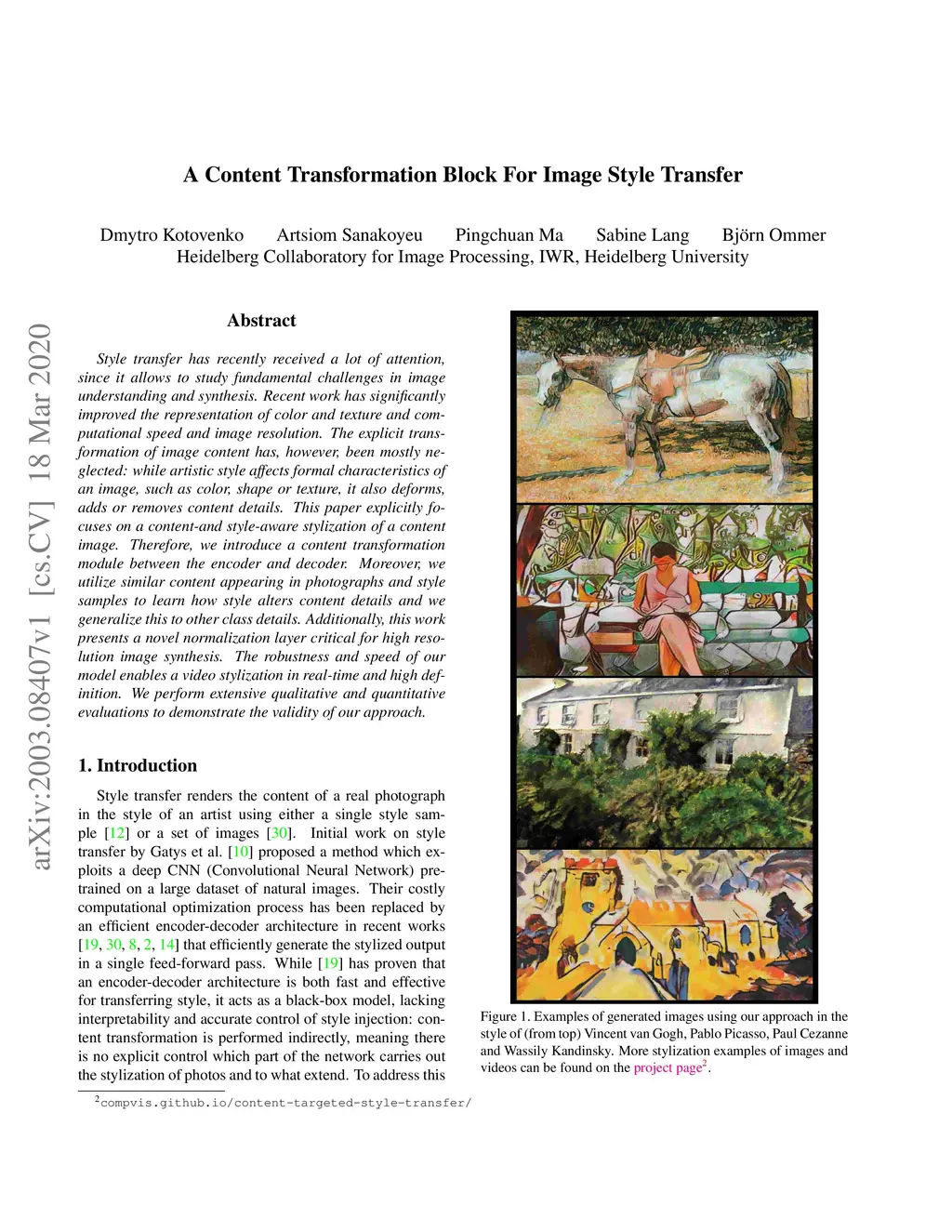 Style transfer has recently received a lot of attention, since it allows to study fundamental challenges in image understanding and synthesis. Recent work has significantly improved the representation of color and texture and computational speed and image resolution. The explicit transformation of image content has, however, been mostly neglected: while artistic style affects formal characteristics of an image, such as color, shape or texture, it also deforms, adds or removes content details. This paper explicitly focuses on a content-and style-aware stylization of a content image. Therefore, we introduce a content transformation module between the encoder and decoder. Moreover, we utilize similar content appearing in photographs and style samples to learn how style alters content details and we generalize this to other class details. Additionally, this work presents a novel normalization layer critical for high resolution image synthesis. The robustness and speed of our model enables a video stylization in real-time and high definition. We perform extensive qualitative and quantitative evaluations to demonstrate the validity of our approach.