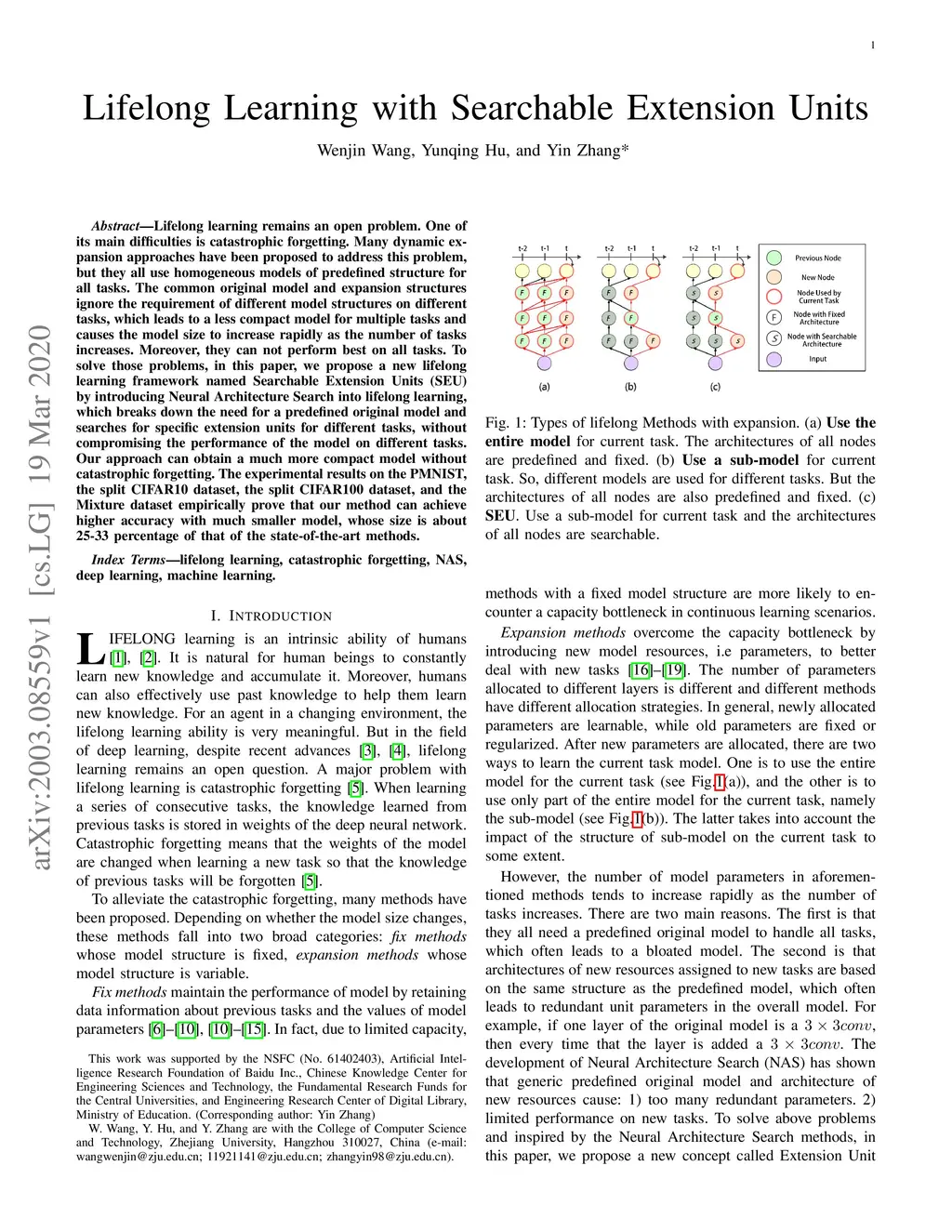 Lifelong learning remains an open problem. One of its main difficulties is catastrophic forgetting. Many dynamic expansion approaches have been proposed to address this problem, but they all use homogeneous models of predefined structure for all tasks. The common original model and expansion structures ignore the requirement of different model structures on different tasks, which leads to a less compact model for multiple tasks and causes the model size to increase rapidly as the number of tasks increases. Moreover, they can not perform best on all tasks. To solve those problems, in this paper, we propose a new lifelong learning framework named Searchable Extension Units (SEU) by introducing Neural Architecture Search into lifelong learning, which breaks down the need for a predefined original model and searches for specific extension units for different tasks, without compromising the performance of the model on different tasks. Our approach can obtain a much more compact model without catastrophic forgetting. The experimental results on the PMNIST, the split CIFAR10 dataset, the split CIFAR100 dataset, and the Mixture dataset empirically prove that our method can achieve higher accuracy with much smaller model, whose size is about 25-33 percentage of that of the state-of-the-art methods.