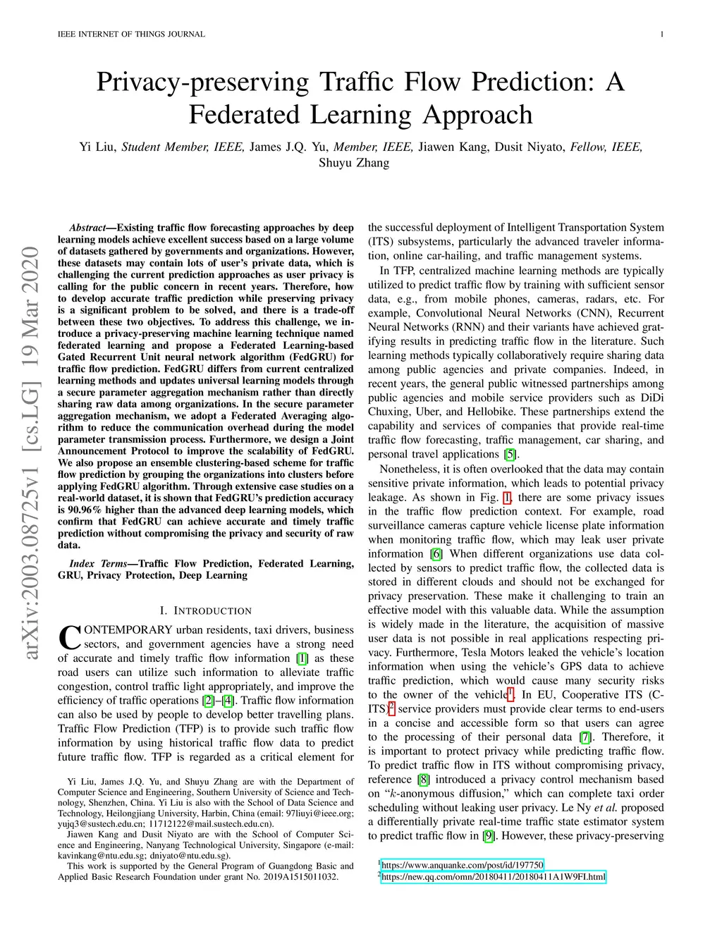Existing traffic flow forecasting approaches by deep learning models achieve excellent success based on a large volume of datasets gathered by governments and organizations. However, these datasets may contain lots of user's private data, which is challenging the current prediction approaches as user privacy is calling for the public concern in recent years. Therefore, how to develop accurate traffic prediction while preserving privacy is a significant problem to be solved, and there is a trade-off between these two objectives. To address this challenge, we introduce a privacy-preserving machine learning technique named federated learning and propose a Federated Learning-based Gated Recurrent Unit neural network algorithm (FedGRU) for traffic flow prediction. FedGRU differs from current centralized learning methods and updates universal learning models through a secure parameter aggregation mechanism rather than directly sharing raw data among organizations. In the secure parameter aggregation mechanism, we adopt a Federated Averaging algorithm to reduce the communication overhead during the model parameter transmission process. Furthermore, we design a Joint Announcement Protocol to improve the scalability of FedGRU. We also propose an ensemble clustering-based scheme for traffic flow prediction by grouping the organizations into clusters before applying FedGRU algorithm. Through extensive case studies on a real-world dataset, it is shown that FedGRU's prediction accuracy is 90.96% higher than the advanced deep learning models, which confirm that FedGRU can achieve accurate and timely traffic prediction without compromising the privacy and security of raw data.