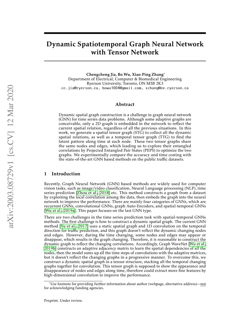 Dynamic spatial graph construction is a challenge in graph neural network (GNN) for time series data problems. Although some adaptive graphs are conceivable, only a 2D graph is embedded in the network to reflect the current spatial relation, regardless of all the previous situations. In this work, we generate a spatial tensor graph (STG) to collect all the dynamic spatial relations, as well as a temporal tensor graph (TTG) to find the latent pattern along time at each node. These two tensor graphs share the same nodes and edges, which leading us to explore their entangled correlations by Projected Entangled Pair States (PEPS) to optimize the two graphs. We experimentally compare the accuracy and time costing with the state-of-the-art GNN based methods on the public traffic datasets.