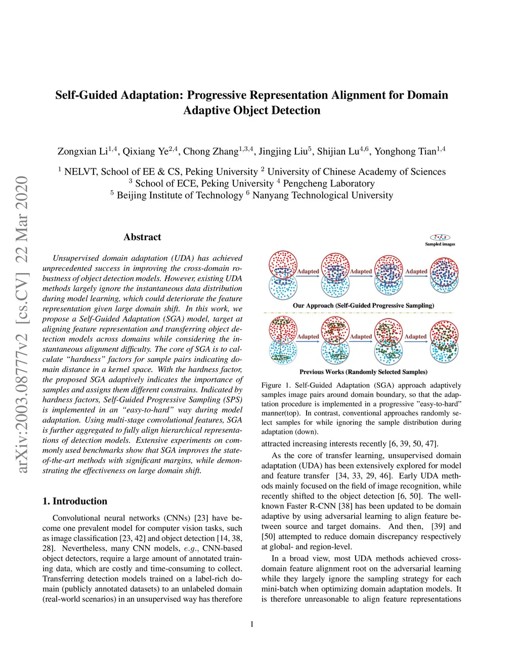 Unsupervised domain adaptation (UDA) has achieved unprecedented success in improving the cross-domain robustness of object detection models. However, existing UDA methods largely ignore the instantaneous data distribution during model learning, which could deteriorate the feature representation given large domain shift. In this work, we propose a Self-Guided Adaptation (SGA) model, target at aligning feature representation and transferring object detection models across domains while considering the instantaneous alignment difficulty. The core of SGA is to calculate "hardness" factors for sample pairs indicating domain distance in a kernel space. With the hardness factor, the proposed SGA adaptively indicates the importance of samples and assigns them different constrains. Indicated by hardness factors, Self-Guided Progressive Sampling (SPS) is implemented in an "easy-to-hard" way during model adaptation. Using multi-stage convolutional features, SGA is further aggregated to fully align hierarchical representations of detection models. Extensive experiments on commonly used benchmarks show that SGA improves the state-of-the-art methods with significant margins, while demonstrating the effectiveness on large domain shift.