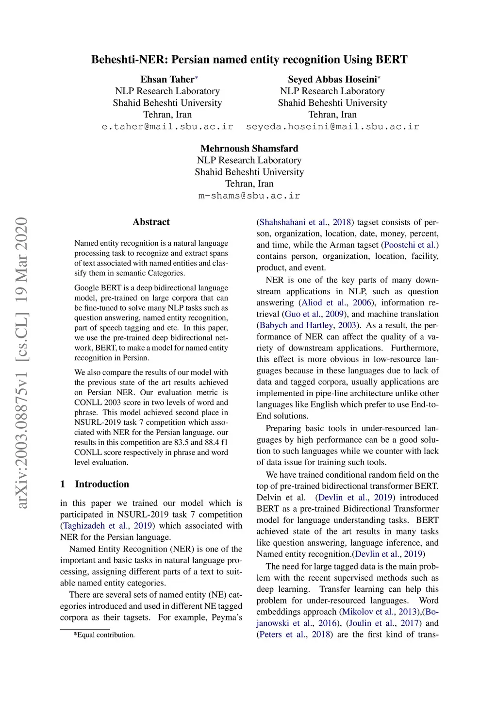 Beheshti-NER: Persian Named Entity Recognition Using BERT
