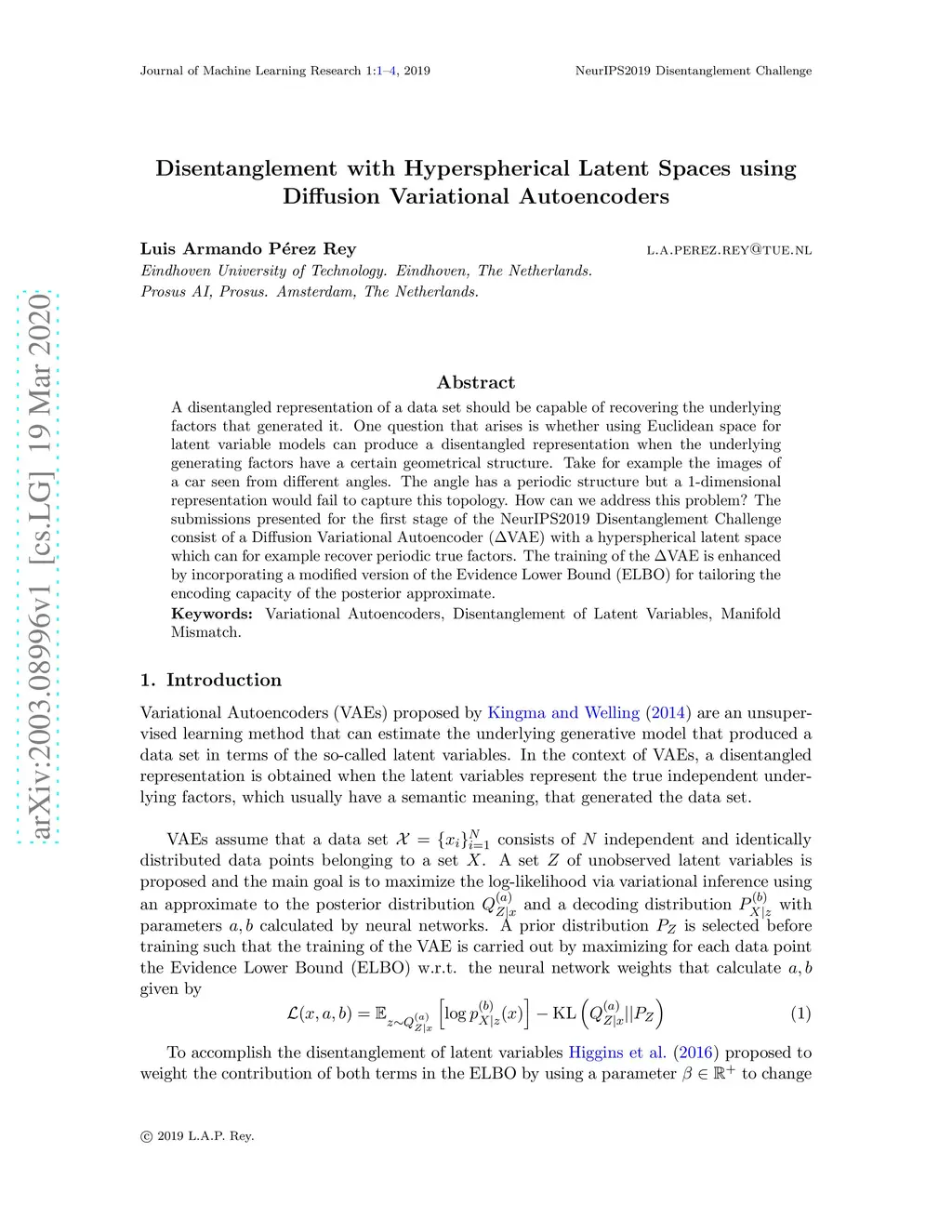 A disentangled representation of a data set should be capable of recovering the underlying factors that generated it. One question that arises is whether using Euclidean space for latent variable models can produce a disentangled representation when the underlying generating factors have a certain geometrical structure. Take for example the images of a car seen from different angles. The angle has a periodic structure but a 1-dimensional representation would fail to capture this topology. How can we address this problem? The submissions presented for the first stage of the NeurIPS2019 Disentanglement Challenge consist of a Diffusion Variational Autoencoder (VAE) with a hyperspherical latent space which can, for example, recover periodic true factors. The training of the VAE is enhanced by incorporating a modified version of the Evidence Lower Bound (ELBO) for tailoring the encoding capacity of the posterior approximate.