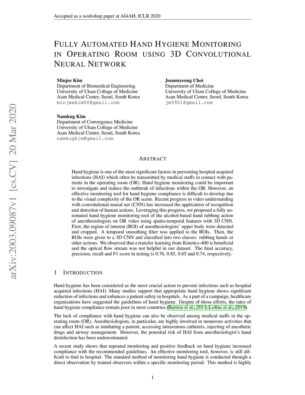 Fully Automated Hand Hygiene Monitoring\\in Operating Room using 3D