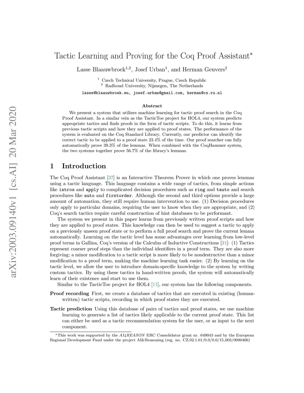 Tactic Learning and Proving for the Coq Proof Assistant