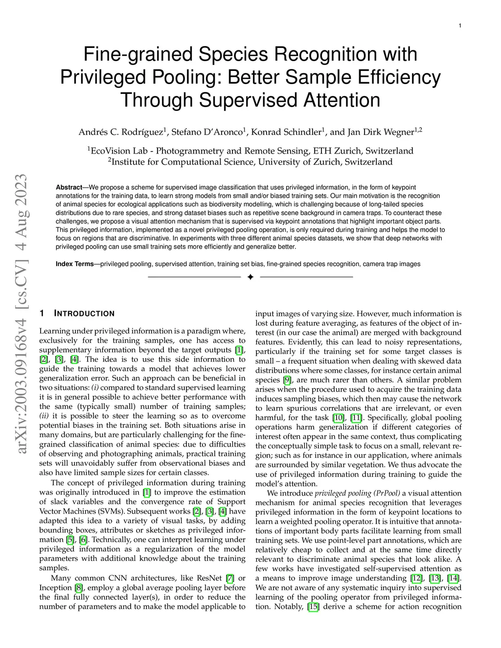 We propose a scheme for supervised image classification that uses privileged information, in the form of keypoint annotations for the training data, to learn strong models from small and/or biased training sets. Our main motivation is the recognition of animal species for ecological applications such as biodiversity modelling, which is challenging because of long-tailed species distributions due to rare species, and strong dataset biases such as repetitive scene background in camera traps. To counteract these challenges, we propose a visual attention mechanism that is supervised via keypoint annotations that highlight important object parts. This privileged information, implemented as a novel privileged pooling operation, is only required during training and helps the model to focus on regions that are discriminative. In experiments with three different animal species datasets, we show that deep networks with privileged pooling can use small training sets more efficiently and generalize better.