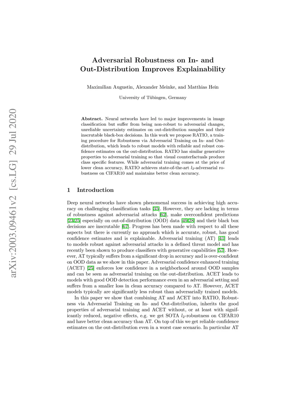 Neural networks have led to major improvements in image classification but suffer from being non-robust to adversarial changes, unreliable uncertainty estimates on out-distribution samples and their inscrutable black-box decisions. In this work we propose RATIO, a training procedure for Robustness via Adversarial Training on In- and Out-distribution, which leads to robust models with reliable and robust confidence estimates on the out-distribution. RATIO has similar generative properties to adversarial training so that visual counterfactuals produce class specific features. While adversarial training comes at the price of lower clean accuracy, RATIO achieves state-of-the-art -adversarial robustness on CIFAR10 and maintains better clean accuracy.