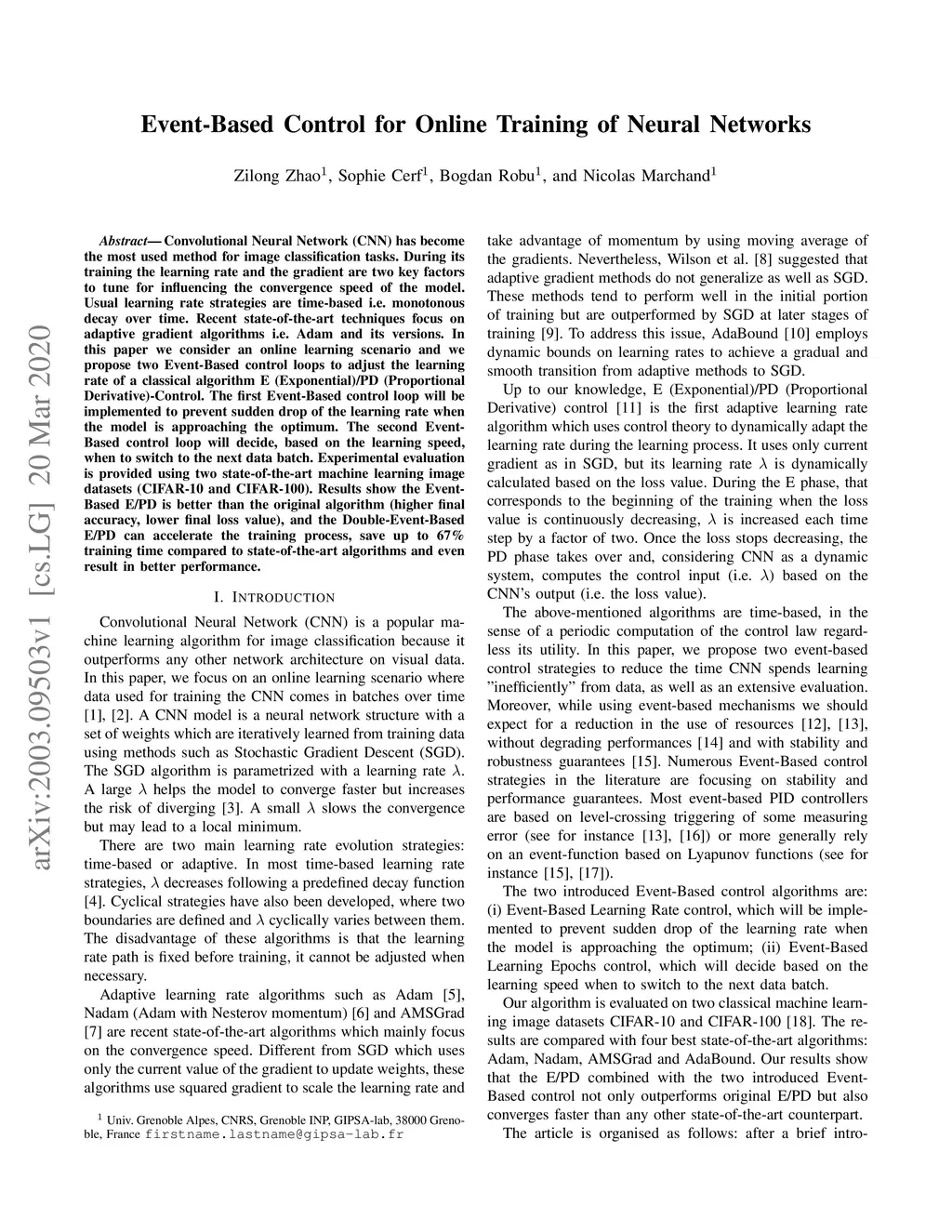 Convolutional Neural Network (CNN) has become the most used method for image classification tasks. During its training the learning rate and the gradient are two key factors to tune for influencing the convergence speed of the model. Usual learning rate strategies are time-based i.e. monotonous decay over time. Recent state-of-the-art techniques focus on adaptive gradient algorithms i.e. Adam and its versions. In this paper we consider an online learning scenario and we propose two Event-Based control loops to adjust the learning rate of a classical algorithm E (Exponential)/PD (Proportional Derivative)-Control. The first Event-Based control loop will be implemented to prevent sudden drop of the learning rate when the model is approaching the optimum. The second Event-Based control loop will decide, based on the learning speed, when to switch to the next data batch. Experimental evaluationis provided using two state-of-the-art machine learning image datasets (CIFAR-10 and CIFAR-100). Results show the Event-Based E/PD is better than the original algorithm (higher final accuracy, lower final loss value), and the Double-Event-BasedE/PD can accelerate the training process, save up to 67% training time compared to state-of-the-art algorithms and even result in better performance.