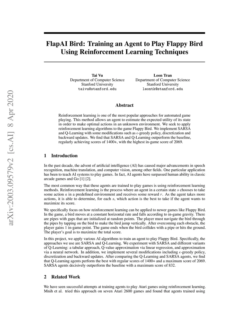Reinforcement learning is one of the most popular approaches for automated game playing. This method allows an agent to estimate the expected utility of its state in order to make optimal actions in an unknown environment. We seek to apply reinforcement learning algorithms to the game Flappy Bird. We implement SARSA and Q-Learning with some modifications such as -greedy policy, discretization and backward updates. We find that SARSA and Q-Learning outperform the baseline, regularly achieving scores of 1400+, with the highest in-game score of 2069.