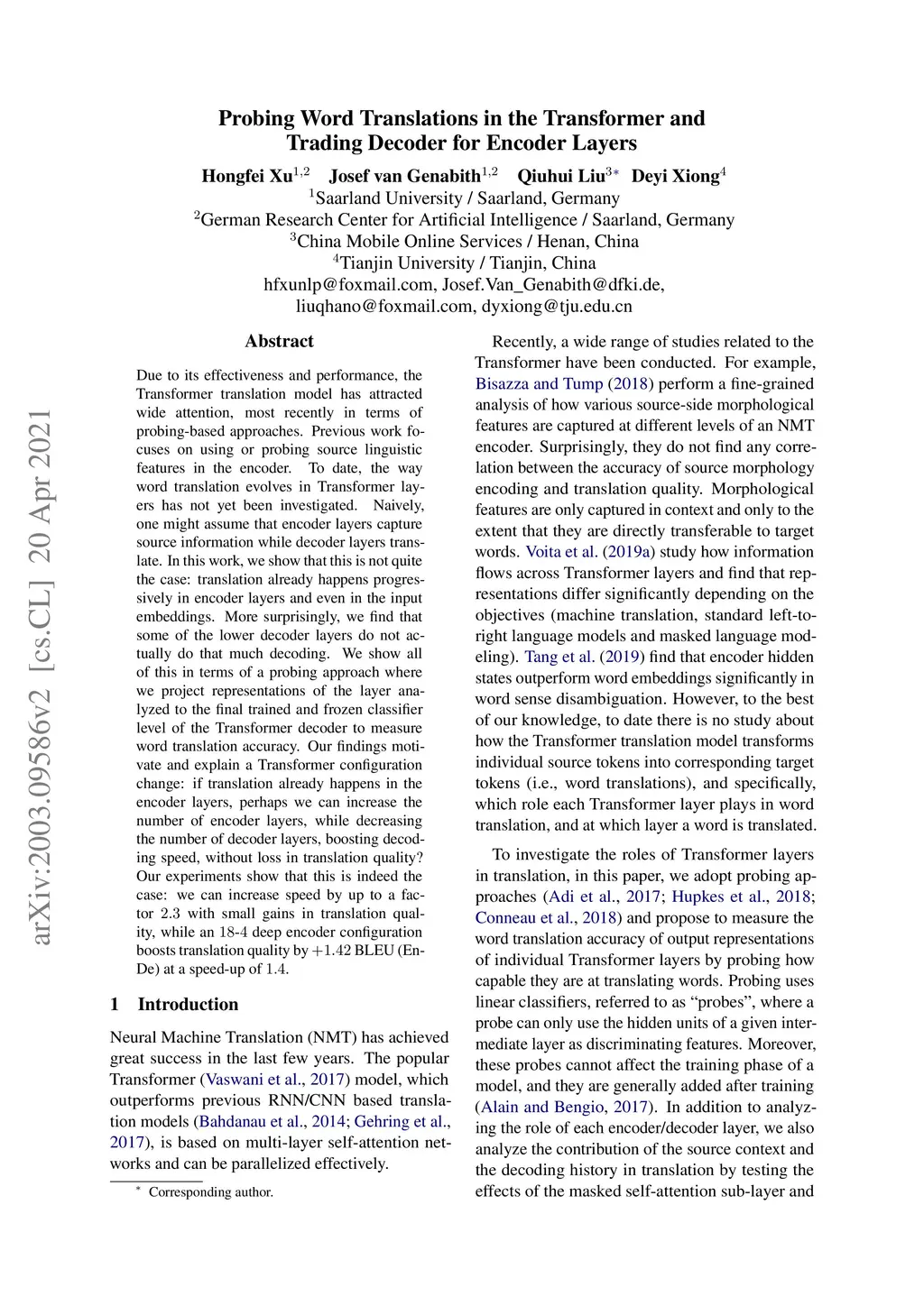 Due to its effectiveness and performance, the Transformer translation model has attracted wide attention, most recently in terms of probing-based approaches. Previous work focuses on using or probing source linguistic features in the encoder. To date, the way word translation evolves in Transformer layers has not yet been investigated. Naively, one might assume that encoder layers capture source information while decoder layers translate. In this work, we show that this is not quite the case: translation already happens progressively in encoder layers and even in the input embeddings. More surprisingly, we find that some of the lower decoder layers do not actually do that much decoding. We show all of this in terms of a probing approach where we project representations of the layer analyzed to the final trained and frozen classifier level of the Transformer decoder to measure word translation accuracy. Our findings motivate and explain a Transformer configuration change: if translation already happens in the encoder layers, perhaps we can increase the number of encoder layers, while decreasing the number of decoder layers, boosting decoding speed, without loss in translation quality? Our experiments show that this is indeed the case: we can increase speed by up to a factor 2.3 with small gains in translation quality, while an 18-4 deep encoder configuration boosts translation quality by +1.42 BLEU (En-De) at a speed-up of 1.4.