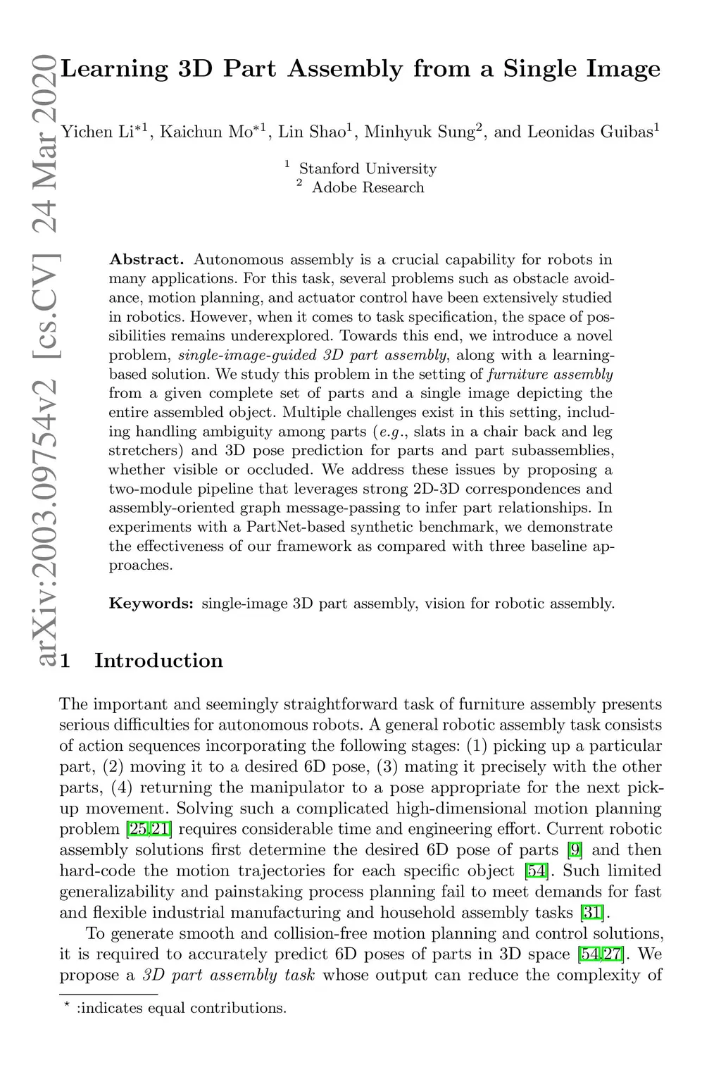 Autonomous assembly is a crucial capability for robots in many applications. For this task, several problems such as obstacle avoidance, motion planning, and actuator control have been extensively studied in robotics. However, when it comes to task specification, the space of possibilities remains underexplored. Towards this end, we introduce a novel problem, single-image-guided 3D part assembly, along with a learningbased solution. We study this problem in the setting of furniture assembly from a given complete set of parts and a single image depicting the entire assembled object. Multiple challenges exist in this setting, including handling ambiguity among parts (e.g., slats in a chair back and leg stretchers) and 3D pose prediction for parts and part subassemblies, whether visible or occluded. We address these issues by proposing a two-module pipeline that leverages strong 2D-3D correspondences and assembly-oriented graph message-passing to infer part relationships. In experiments with a PartNet-based synthetic benchmark, we demonstrate the effectiveness of our framework as compared with three baseline approaches.
