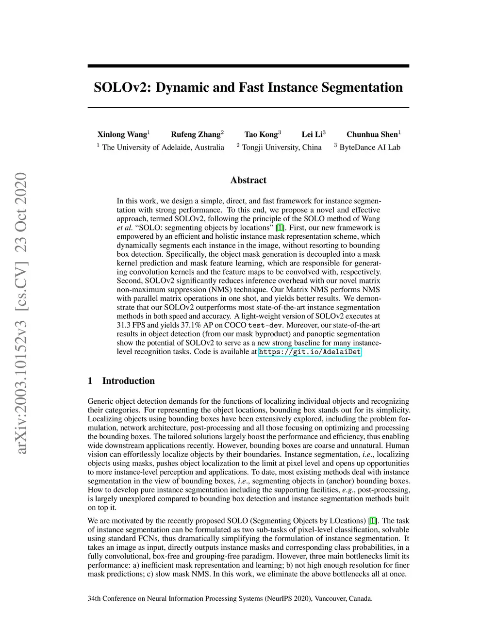 SOLOv2: Dynamic and Fast Instance Segmentation