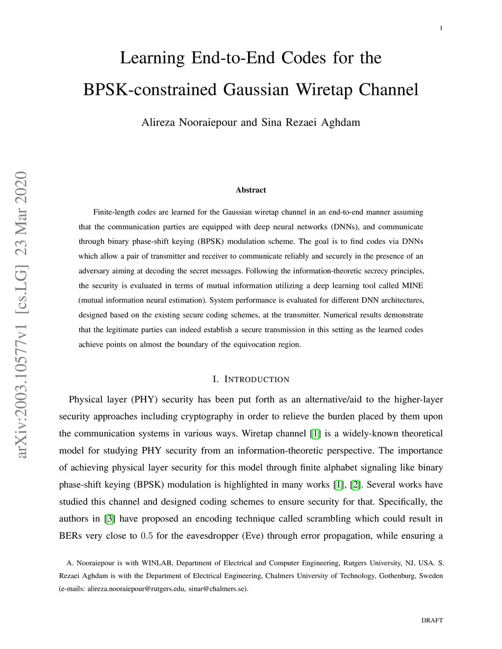 Finite-length codes are learned for the Gaussian wiretap channel in an end-to-end manner assuming that the communication parties are equipped with deep neural networks (DNNs), and communicate through binary phase-shift keying (BPSK) modulation scheme. The goal is to find codes via DNNs which allow a pair of transmitter and receiver to communicate reliably and securely in the presence of an adversary aiming at decoding the secret messages. Following the information-theoretic secrecy principles, the security is evaluated in terms of mutual information utilizing a deep learning tool called MINE (mutual information neural estimation). System performance is evaluated for different DNN architectures, designed based on the existing secure coding schemes, at the transmitter. Numerical results demonstrate that the legitimate parties can indeed establish a secure transmission in this setting as the learned codes achieve points on almost the boundary of the equivocation region.