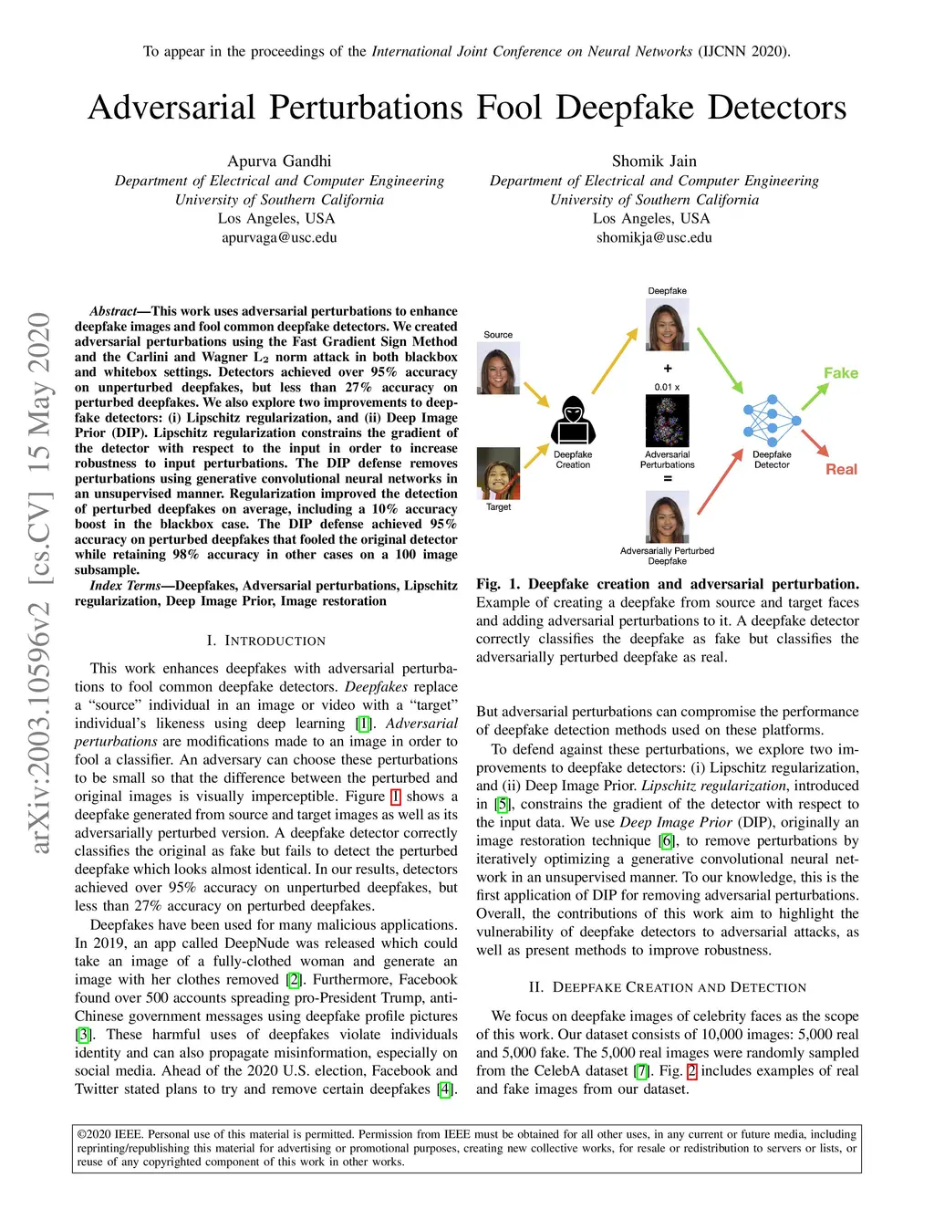This work uses adversarial perturbations to enhance deepfake images and fool common deepfake detectors. We created adversarial perturbations using the Fast Gradient Sign Method and the Carlini and Wagner L2 norm attack in both blackbox and whitebox settings. Detectors achieved over 95% accuracy on unperturbed deepfakes, but less than 27% accuracy on perturbed deepfakes. We also explore two improvements to deepfake detectors: (i) Lipschitz regularization, and (ii) Deep Image Prior (DIP). Lipschitz regularization constrains the gradient of the detector with respect to the input in order to increase robustness to input perturbations. The DIP defense removes perturbations using generative convolutional neural networks in an unsupervised manner. Regularization improved the detection of perturbed deepfakes on average, including a 10% accuracy boost in the blackbox case. The DIP defense achieved 95% accuracy on perturbed deepfakes that fooled the original detector, while retaining 98% accuracy in other cases on a 100 image subsample.