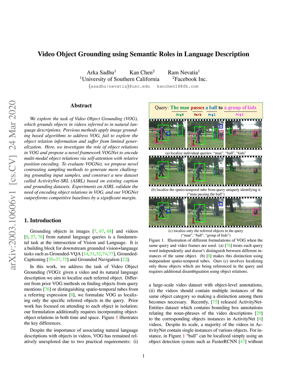 We explore the task of Video Object Grounding (VOG), which grounds objects in videos referred to in natural language descriptions. Previous methods apply image grounding based algorithms to address VOG, fail to explore the object relation information and suffer from limited generalization. Here, we investigate the role of object relations in VOG and propose a novel framework VOGNet to encode multi-modal object relations via self-attention with relative position encoding. To evaluate VOGNet, we propose novel contrasting sampling methods to generate more challenging grounding input samples, and construct a new dataset called ActivityNet-SRL (ASRL) based on existing caption and grounding datasets. Experiments on ASRL validate the need of encoding object relations in VOG, and our VOGNet outperforms competitive baselines by a significant margin.