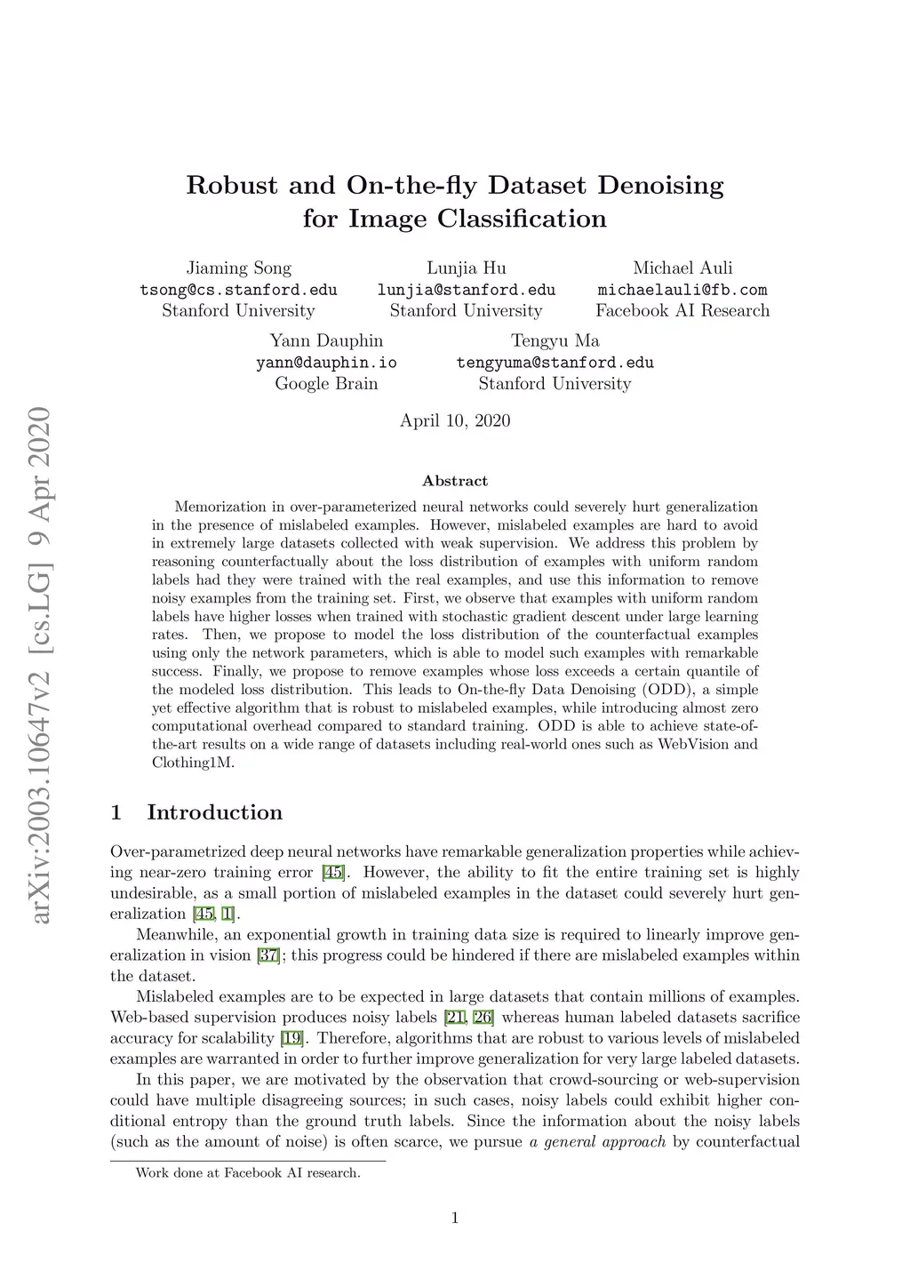 Memorization in over-parameterized neural networks could severely hurt generalization in the presence of mislabeled examples. However, mislabeled examples are hard to avoid in extremely large datasets collected with weak supervision. We address this problem by reasoning counterfactually about the loss distribution of examples with uniform random labels had they were trained with the real examples, and use this information to remove noisy examples from the training set. First, we observe that examples with uniform random labels have higher losses when trained with stochastic gradient descent under large learning rates. Then, we propose to model the loss distribution of the counterfactual examples using only the network parameters, which is able to model such examples with remarkable success. Finally, we propose to remove examples whose loss exceeds a certain quantile of the modeled loss distribution. This leads to On-the-fly Data Denoising (ODD), a simple yet effective algorithm that is robust to mislabeled examples, while introducing almost zero computational overhead compared to standard training. ODD is able to achieve state-of-the-art results on a wide range of datasets including real-world ones such as WebVision and Clothing1M.